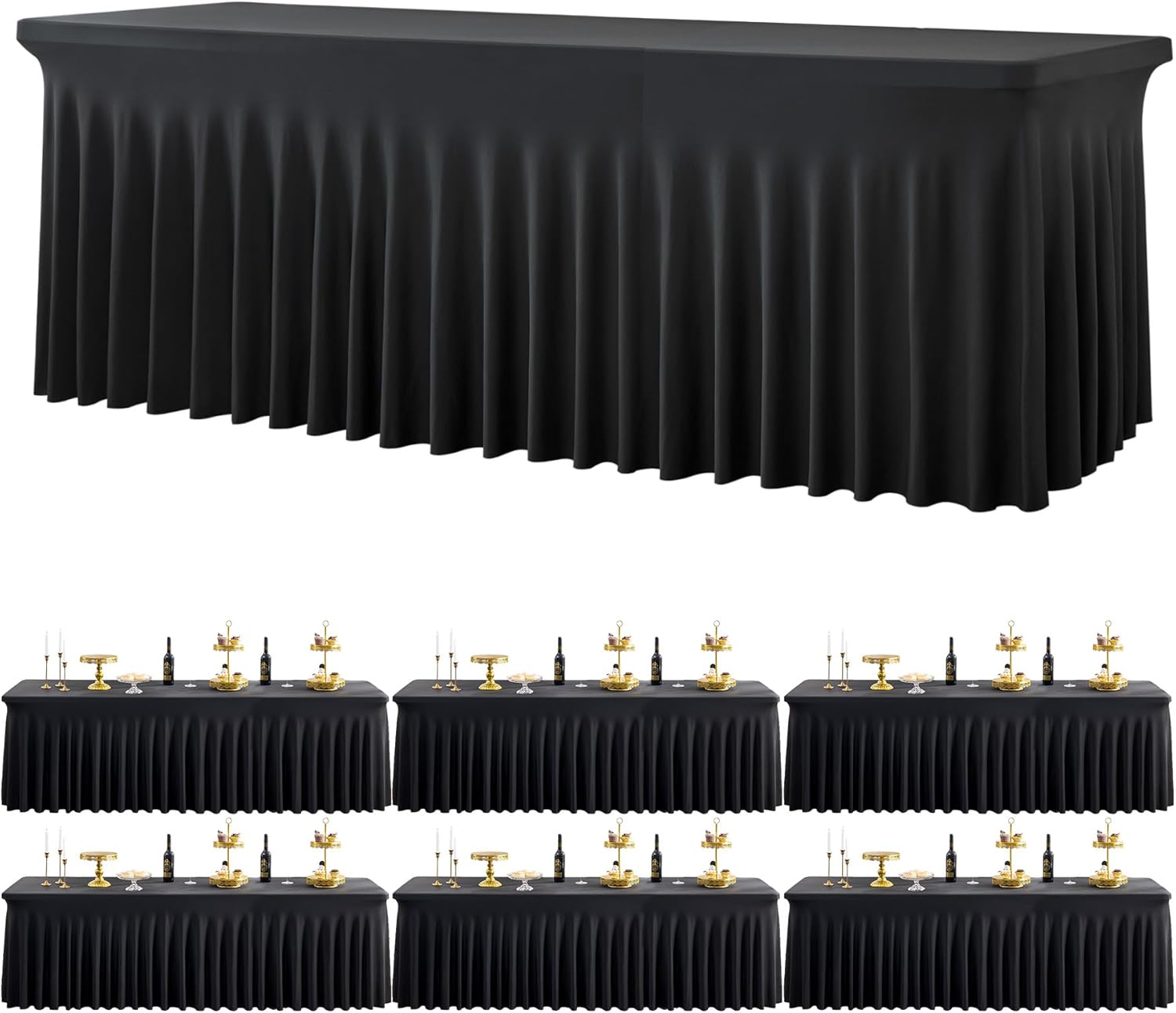 Black Spandex Tablecloth for 8 Foot Rectangle Tables, 6 Pack Black Wrinkle Free Fitted Table Cloths 8ft Stretchy Banquet Table Clothes Cover Desk Skirt for Birthday Wedding Parties Baby Shower