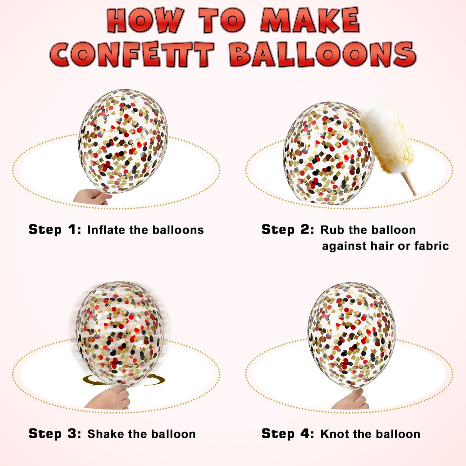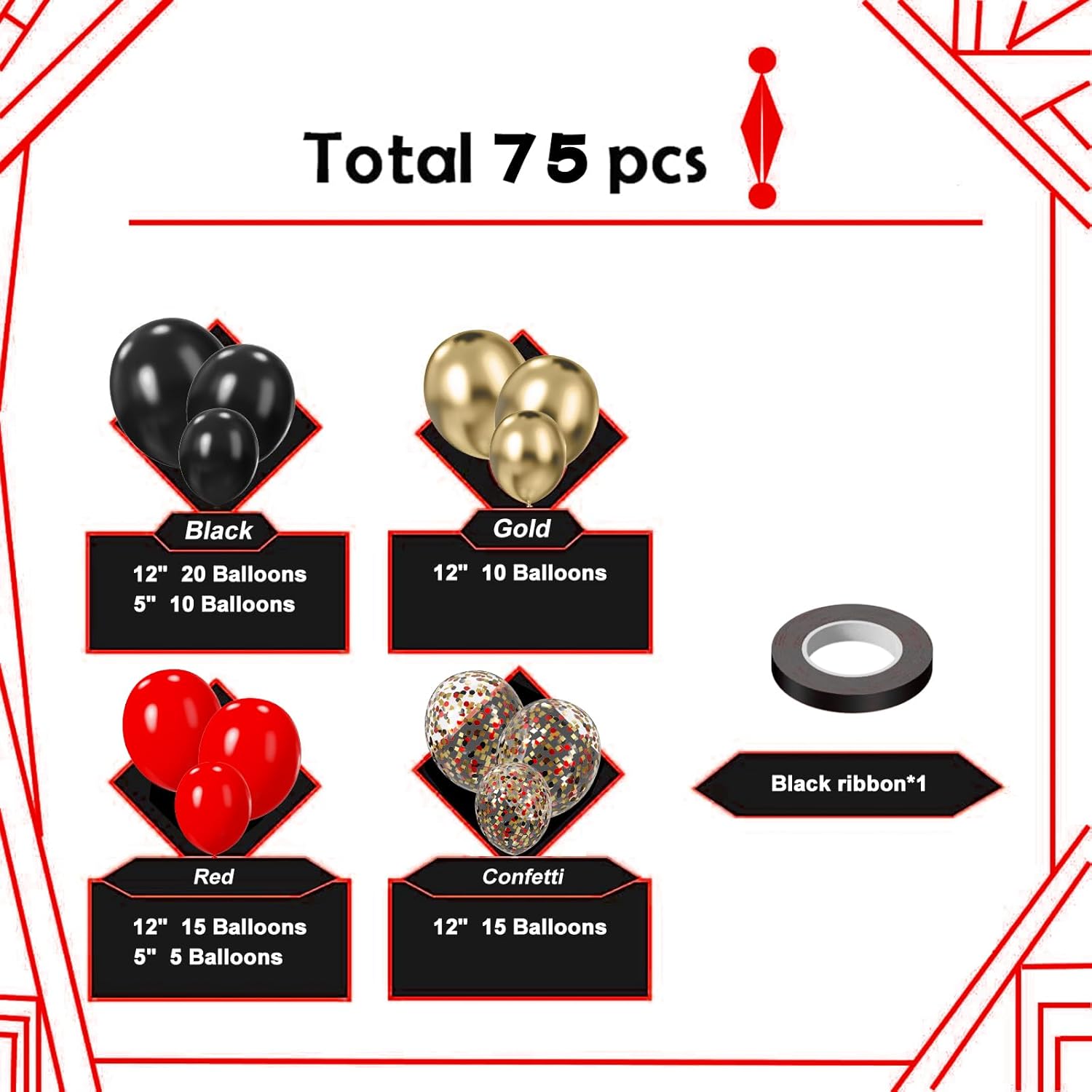 - 🎈【Party Balloon Set Including】Total 75Pcs,12-inch Black balloons*20,red balloons*15,gold balloons*15,gold confetti balloons*15,5-inch Black balloons*10,red balloons*5.different size balloons can help you create more beautiful party decroations!