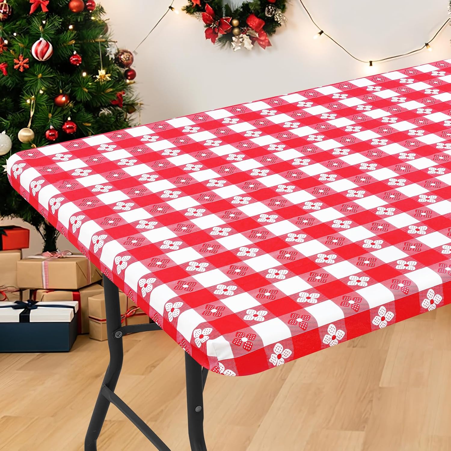 Rectangle Vinyl Table Cloth, Waterproof Elastic Fitted Tablecloth with Flannel Backing, Plastic Table Cover for Picnic, Camping, Outdoor (Red & White, 30"x72")