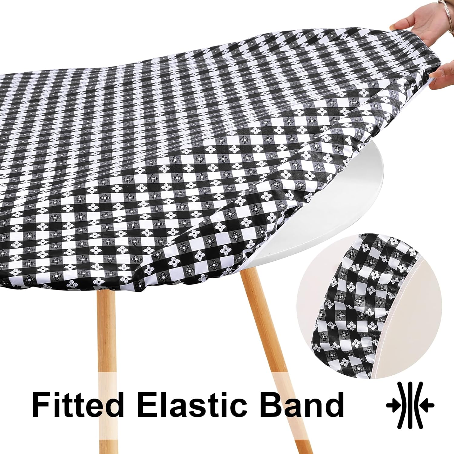 Round Vinyl Table Cloth, Waterproof Elastic Fitted Tablecloth with Flannel Backing, Plastic Table Cover for Picnic, Camping, Outdoor (Black & White, 36" - 44")