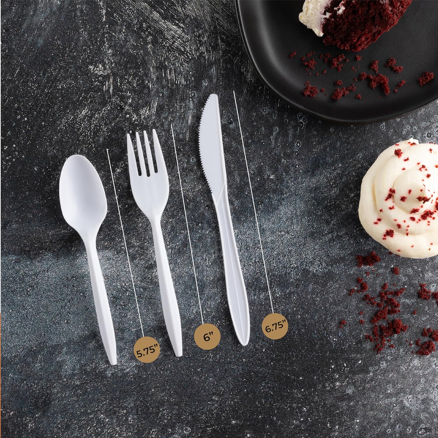 - Bulk Pack disposable cutlery includes 400 pieces 160 white plastic tea spoons, 160 white plastic forks, and 80 white plastic knives.
