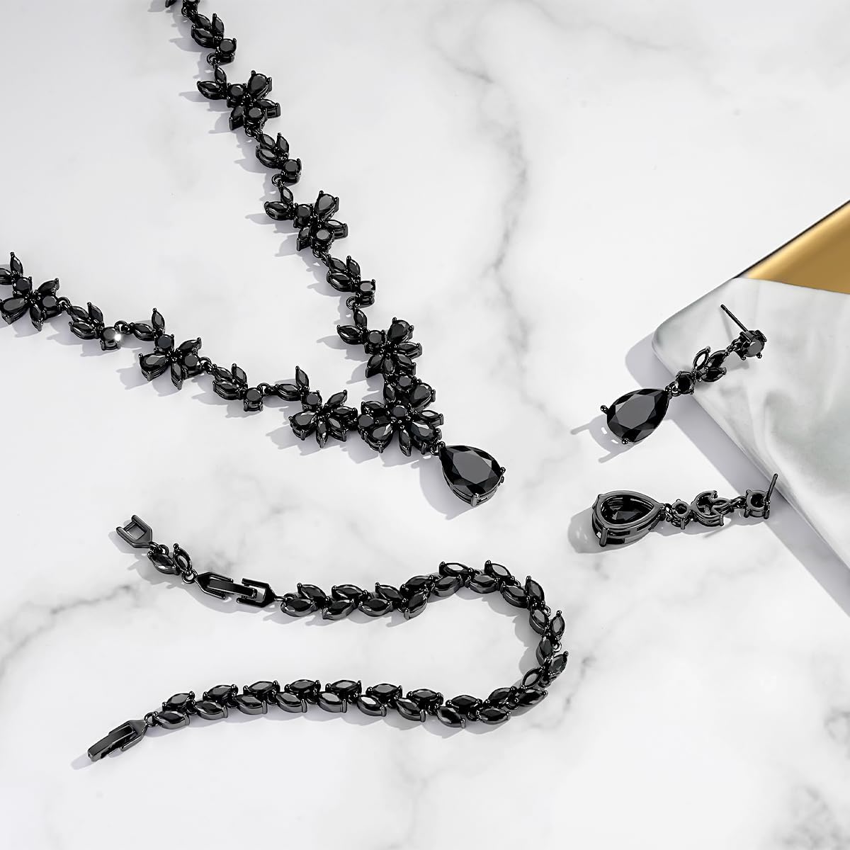 - High Quality Material: This Black Women's Jewelry Set is crafted with AAA Cubic Zirconia. High Polished, Black Plated. Hypoallergenic, and Shiny Forever. Perfect to keep as a Halloween Party, Wedding Prom Coslpay Jewelry. Our Costume Jewelry Set is suitable for almost all Of Sensitive Skin. Hypoallergenic and Shiny Forever. Our Jewellery are suitable for almost all Of Sensitive Ears.