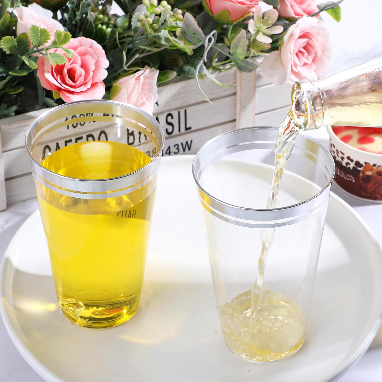 - Sturdy Material: our wedding disposable cups are made of quality plastic, will not easily scratch or break; You can rest assured that it is a good choice for indoor or outdoor use, and the embellished silver rim is not easy to fade, and can be reused