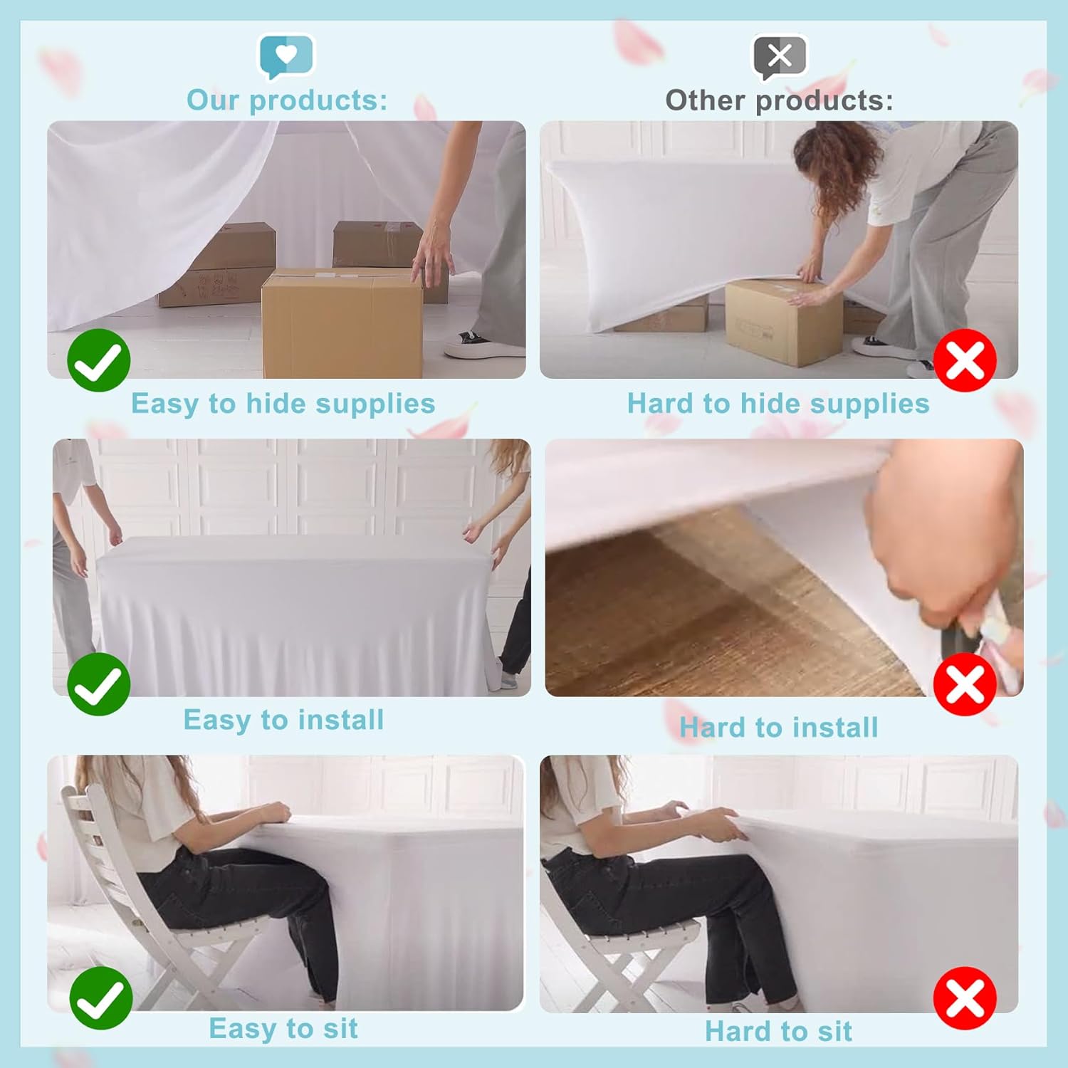 - 【Unique Design Spandex Table Cloth】 - 2-in-1 spandex tablecloth - A white fitted table cover and table skirt combined in a single piece. Its unique fitted design ensures a perfect fit for desk and tables, while simultaneously functioning as an elegant table skirt to enhance the overall appearance of your banquet or event table. Our fitted tablecloth is specifically designed to save your time and simplify the decoration process, making banquette table decoration look elegant and neat.