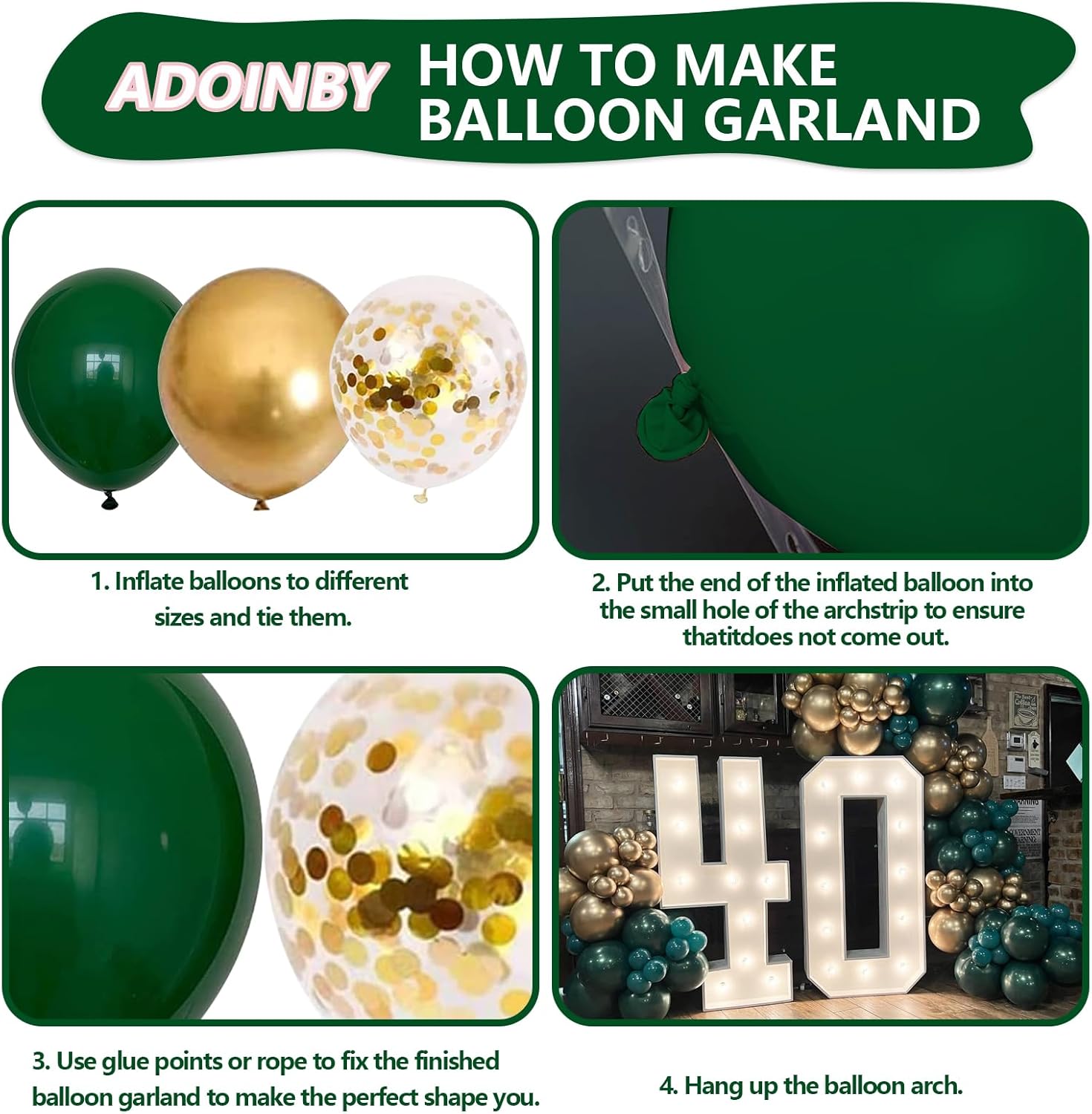- 🎉【Green and Gold Balloon Garland Arch Kit】:Include 18''(Dark green balloons 2, Metallic gold balloons 2),12''(Dark green balloons 21, Metallic gold balloons 21, Gold confetti balloons), 10''(Dark green balloons 21, Metallic gold balloons 21),5''(Dark green balloons 21, Metallic gold balloons 21),16FT garland strip x1,140 dots glue.