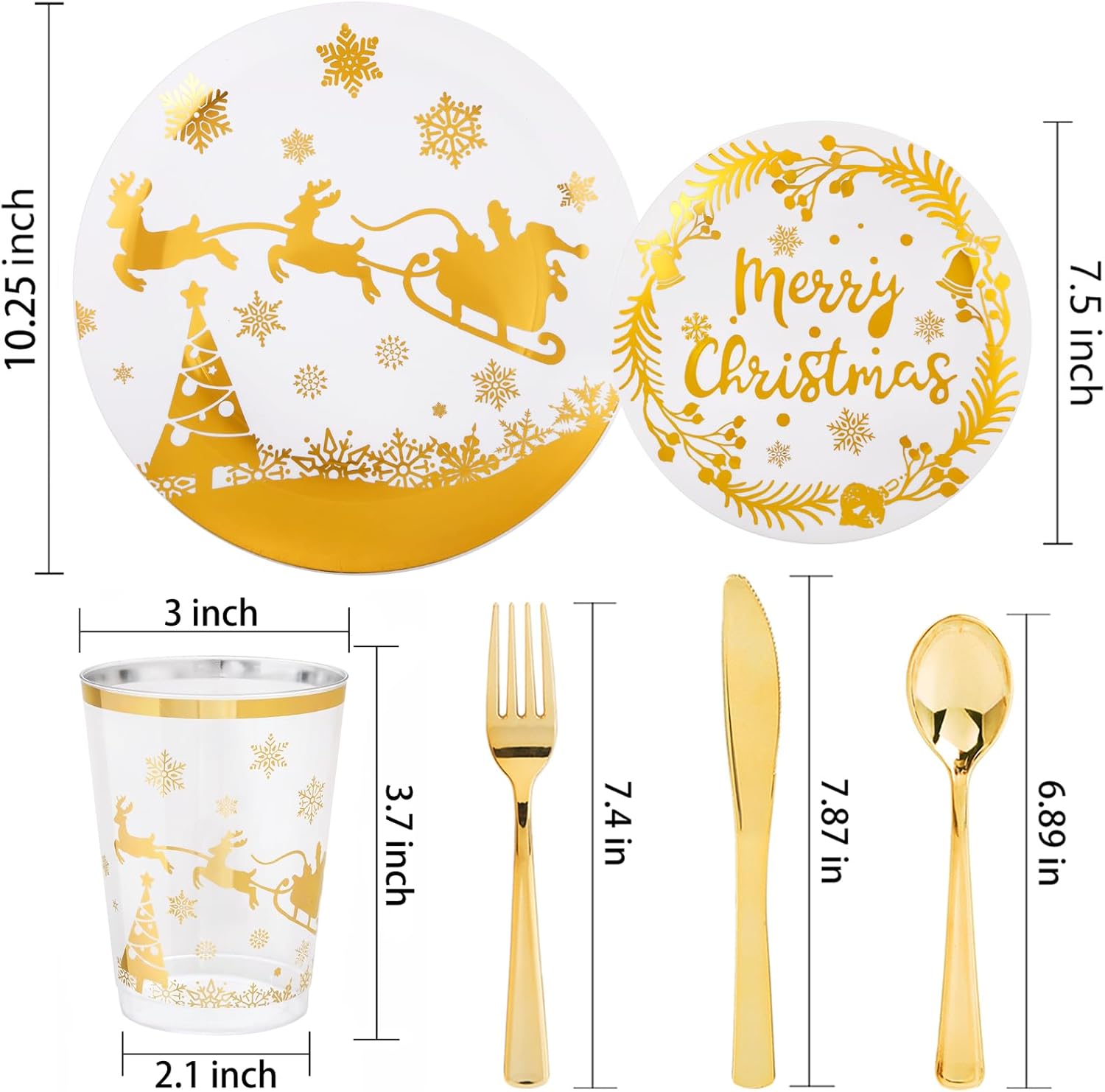 - CHRISTMAS PLASTIC PLATES: Christmas plastic dinnerware includes 25 plastic dinner plates, 25 plastic dessert plates, 25 gold plastic forks, 25 gold plastic knives, 25 gold plastic spoons, 25 gold plastic cups service to 25 guests.