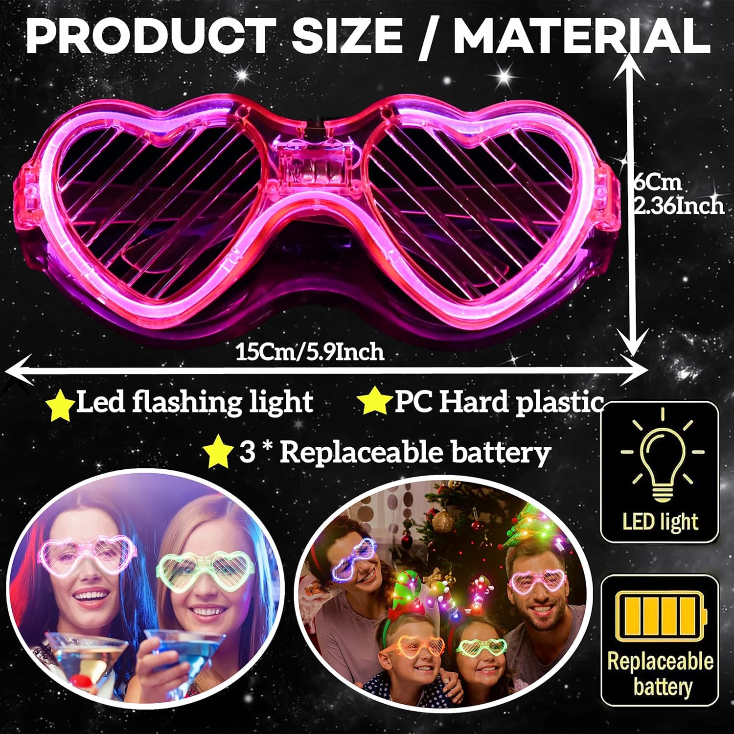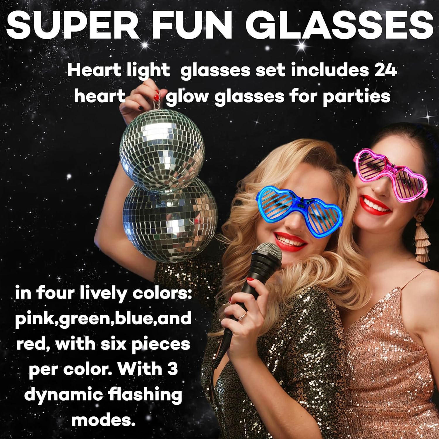 - Value-Packed Shutter Led Light Up Glasses: Glow glasses party pack includes 24 heart glow glasses for parties in four lively colors: pink,green,blue,and red, with six pieces per color. With 3 dynamic flashing modes, These heart glow glasses bring life to holiday parties and celebrations.
