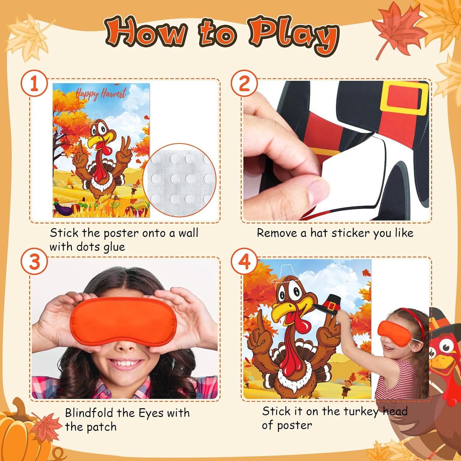 - 🥳Fun Thanksgiving Activities for Kids Party🥳: We provided 20 glue dots, you can effortlessly stick the poster to a wall or window, please try to choose a cleaner and smoother surface, that will stick more firm. And each player need to peel off turkey hat sticker and don the blindfold to commence the game, aim to place the turkey hat as close to the target as possible. The one who gets closest will win the game. Can't wait to play? Give it a try now! It is a fun Thanksgiving kids party games.
