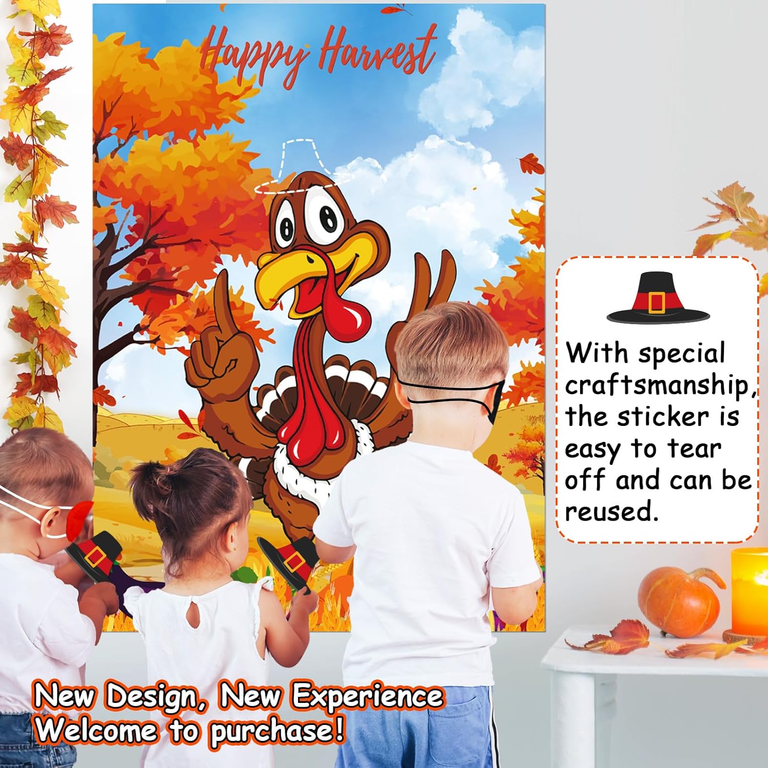 Upgraded, Fall Festival Games for Kids, Pin The Hat on The Turkey, Funny Thanksgiving Games, Classic Design, with Premium Poster, Reusable Stickers, Eye Mask, Ideal Friendsgiving Party Decorations