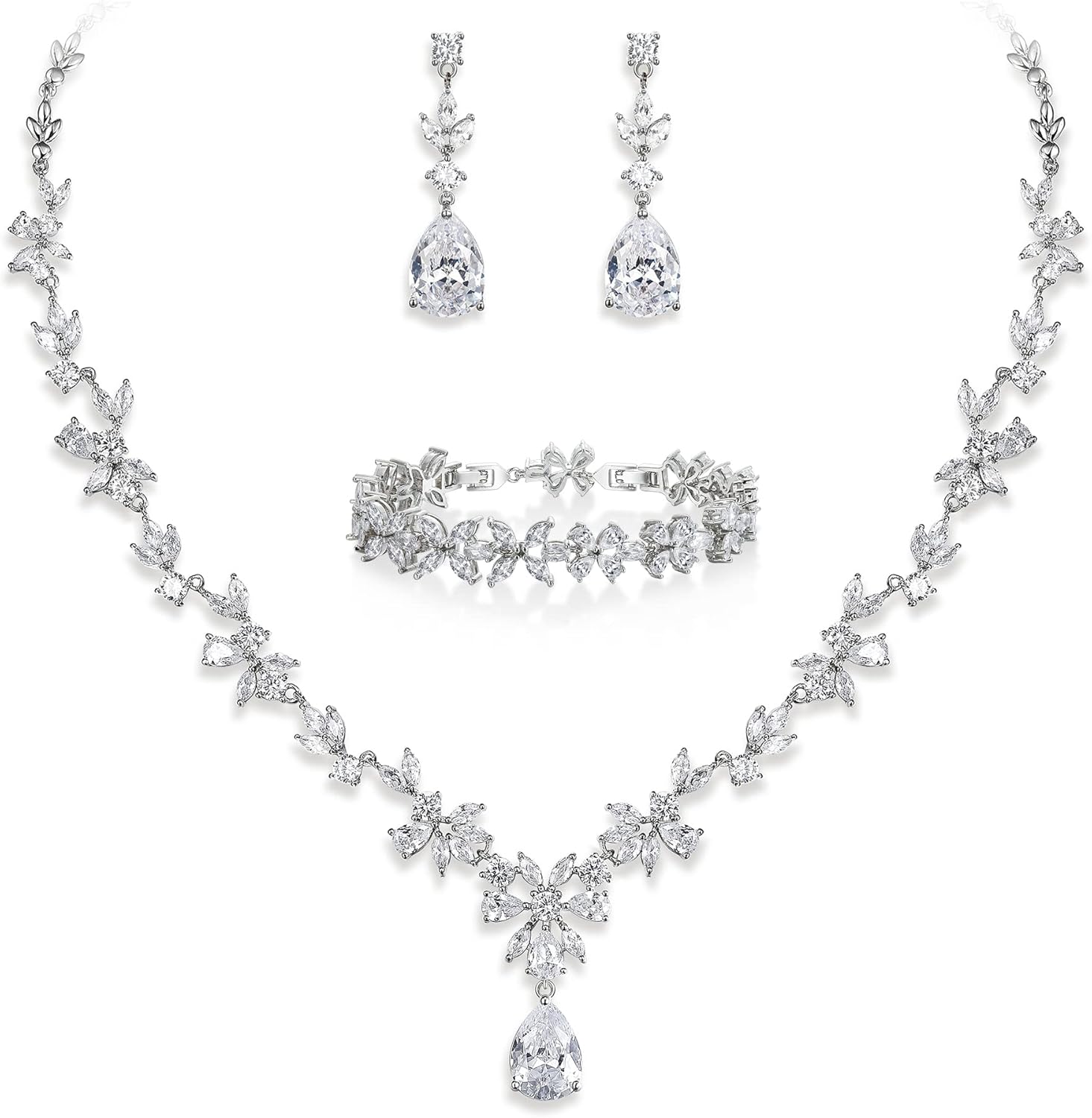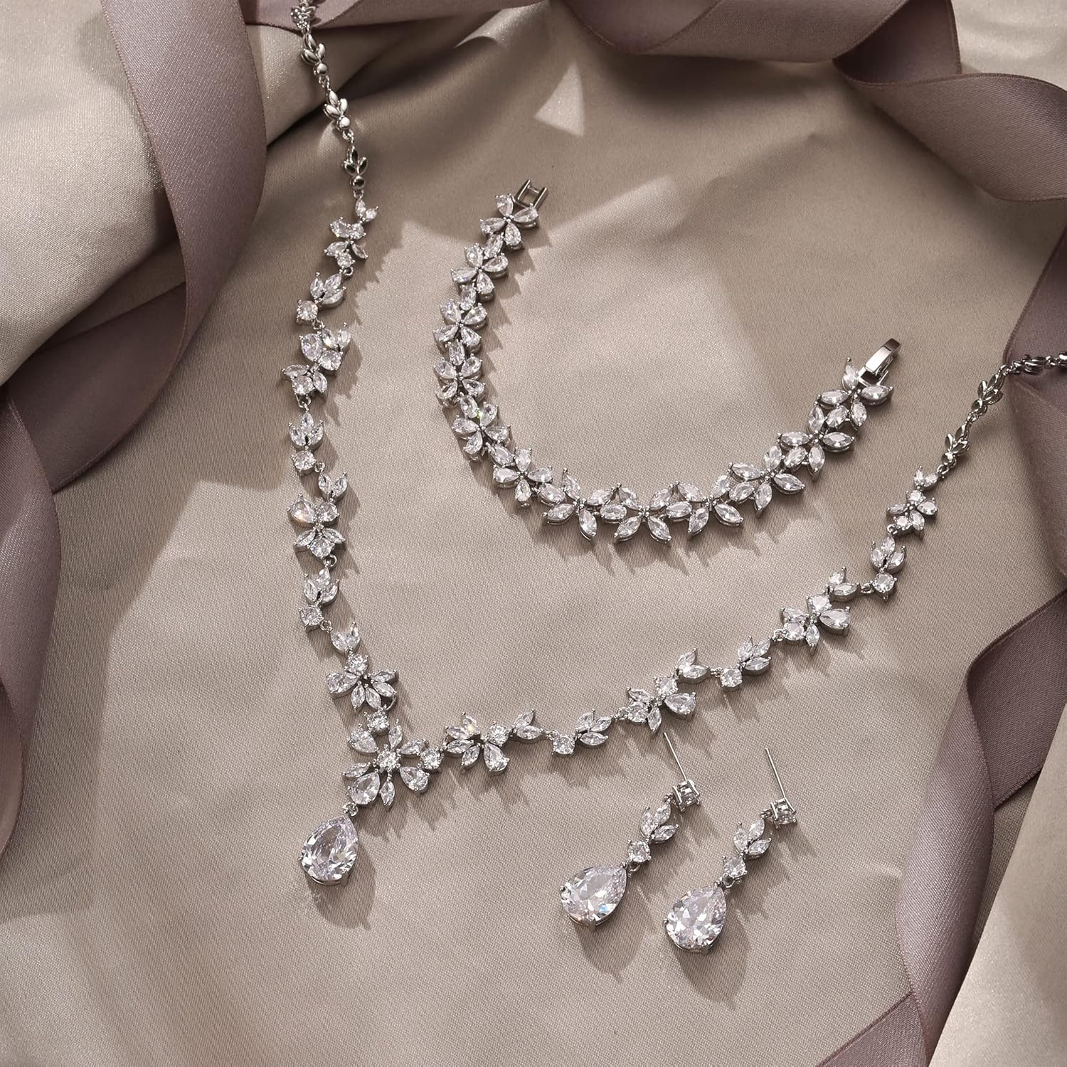 - If you are going out to a party or banquet, this birthstone bridal wedding dangle earrings necklace bracelet set is the perfect accessory that will enhance your outfit. With a fabulous water drop and flower CZ design and solid construction. It features sparkly CZs which will make a timeless accessory to any jewelry collection. This wedding jewelry set can be worn with classy casual or formal attire.