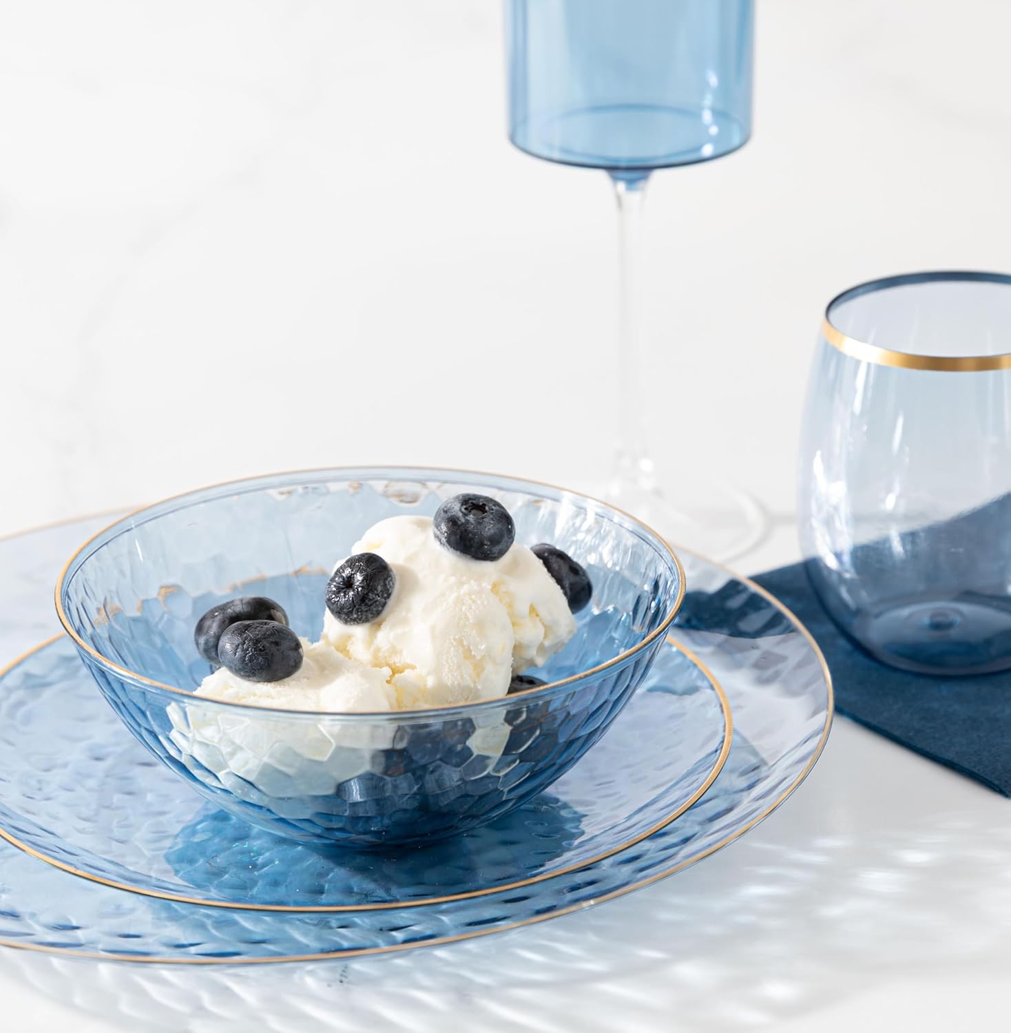 PLASTICPRO 30 Pack 12 Ounce Hammered Plastic Bowls Translucent Blue with Gold Rim Heavyweight Disposable Plastic Soup Bowls Elegant Translucent Hammered Gold Rim Platsic Party Dishes