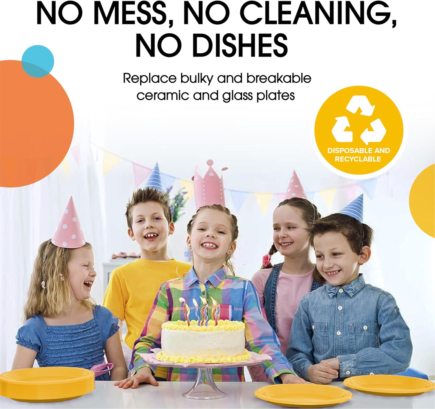 - Health & Safety: Our Yellow plastic plate set is made with food safe materials, ensuring the health and safety of your guests. Whether it's for a birthday party or a picnic, you can trust that these disposable plastic plates meet the highest standards of hygiene, providing peace of mind for you and your loved ones.