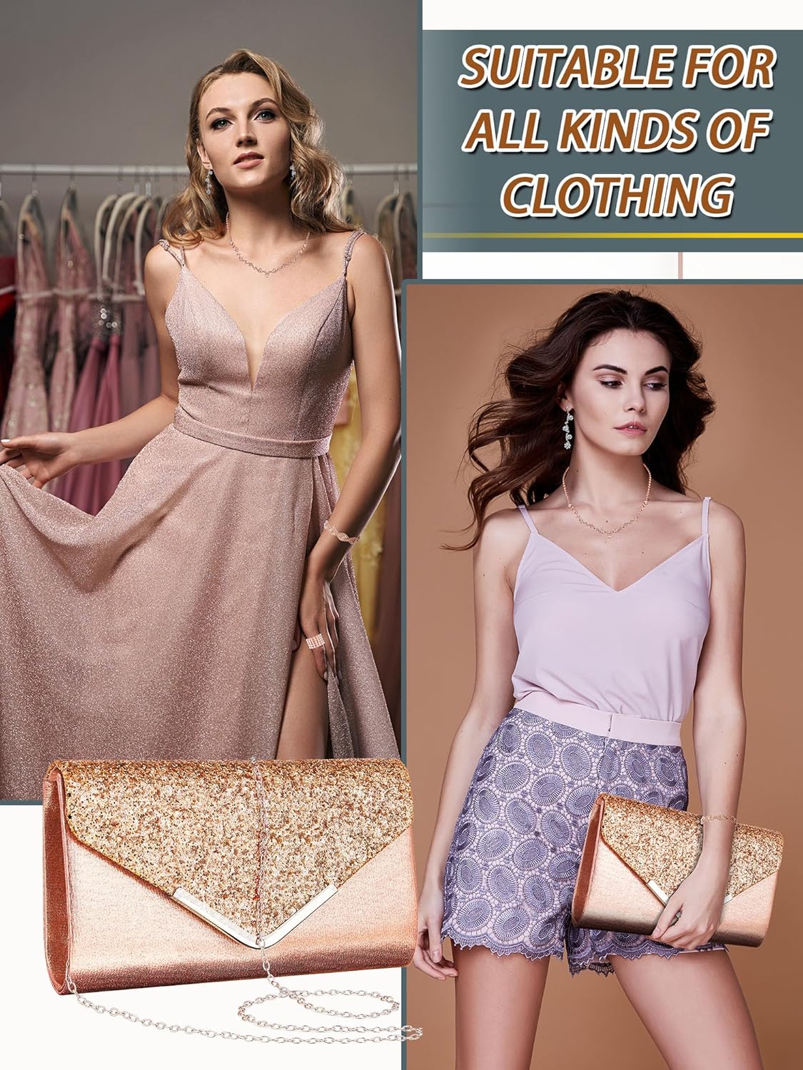 - Rhinestone Jewelry Set: the rose gold jewelry set for women you will receive comprise 1 piece of pink clutch purse, 1 diamond necklace for women, 1 pair of rhinestone ear clips, 1 ring and 1 bridal bracelet, enough for you to match diversified evening dresses or other formal outfits