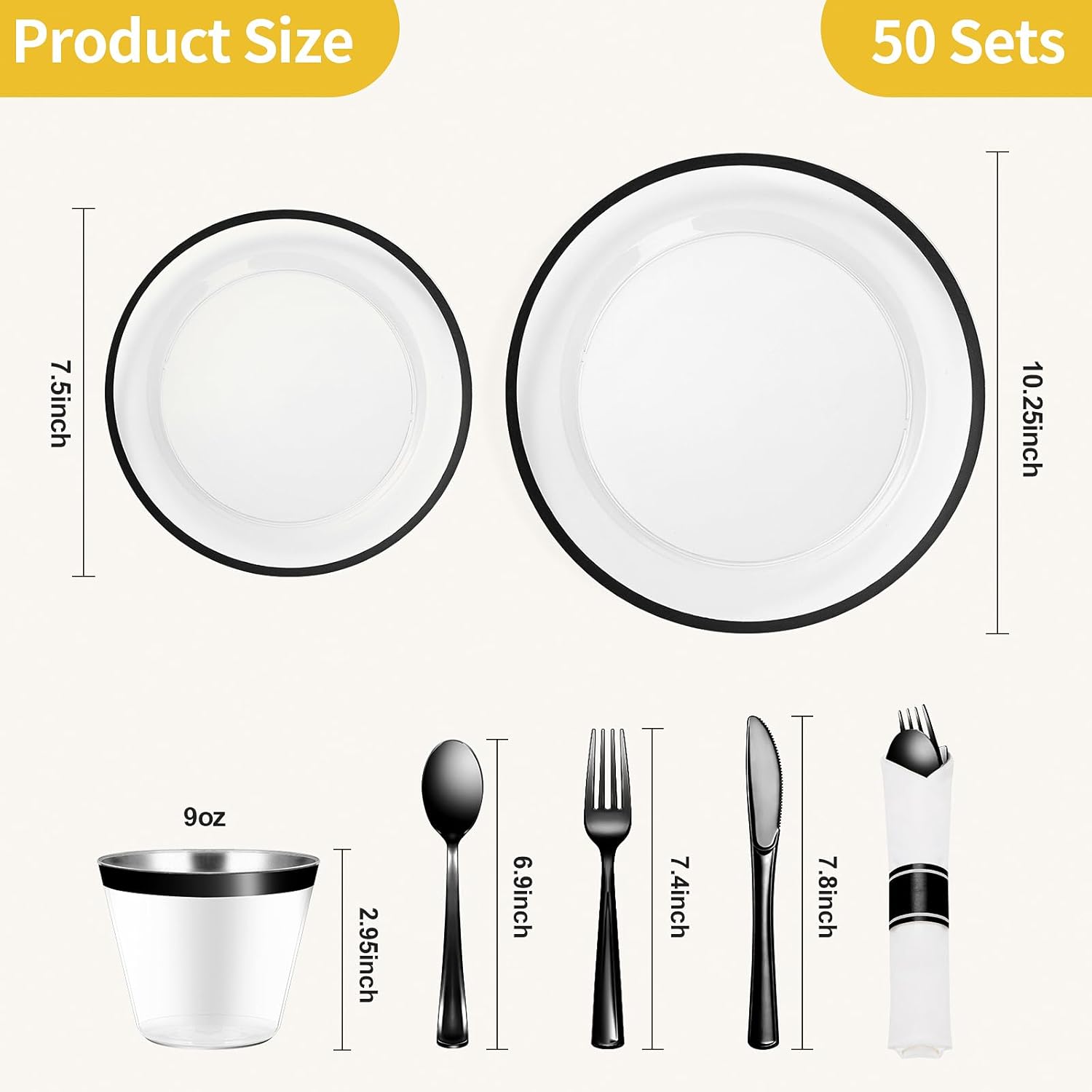 - WHAT YOU GET - Receive a complete set with 350 pieces of black plastic plates for 50 guests, including 50 10.25" disposable dinner plates, 50 7.5" salad plates, 50 paper napkins, 50 9oz cups, 50 knives, 50 forks, and 50 spoons. Note: These party plates are not recommended for use in the microwave or dishwasher.
