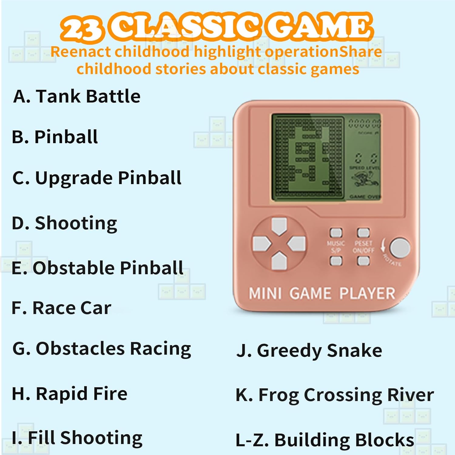 - [ Classic Games for You]: This is a key chain and a mini game console with 26 classic games of "numbers" and "letters", each with 99 different levels of difficulty. It will be popular with most people. You can use it at video game parties, family gatherings, birthday parties