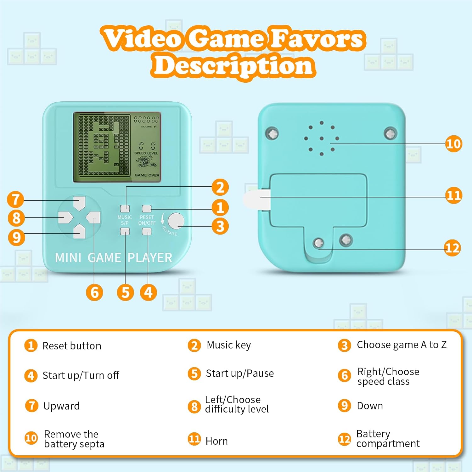 - [Party Family Games]: Video game party favors is suitable for gamer birthday. It's a great thing to pass the time at a party. The classic model is mini and compact, which is very convenient to carry around, so you can also take it out to play when you want