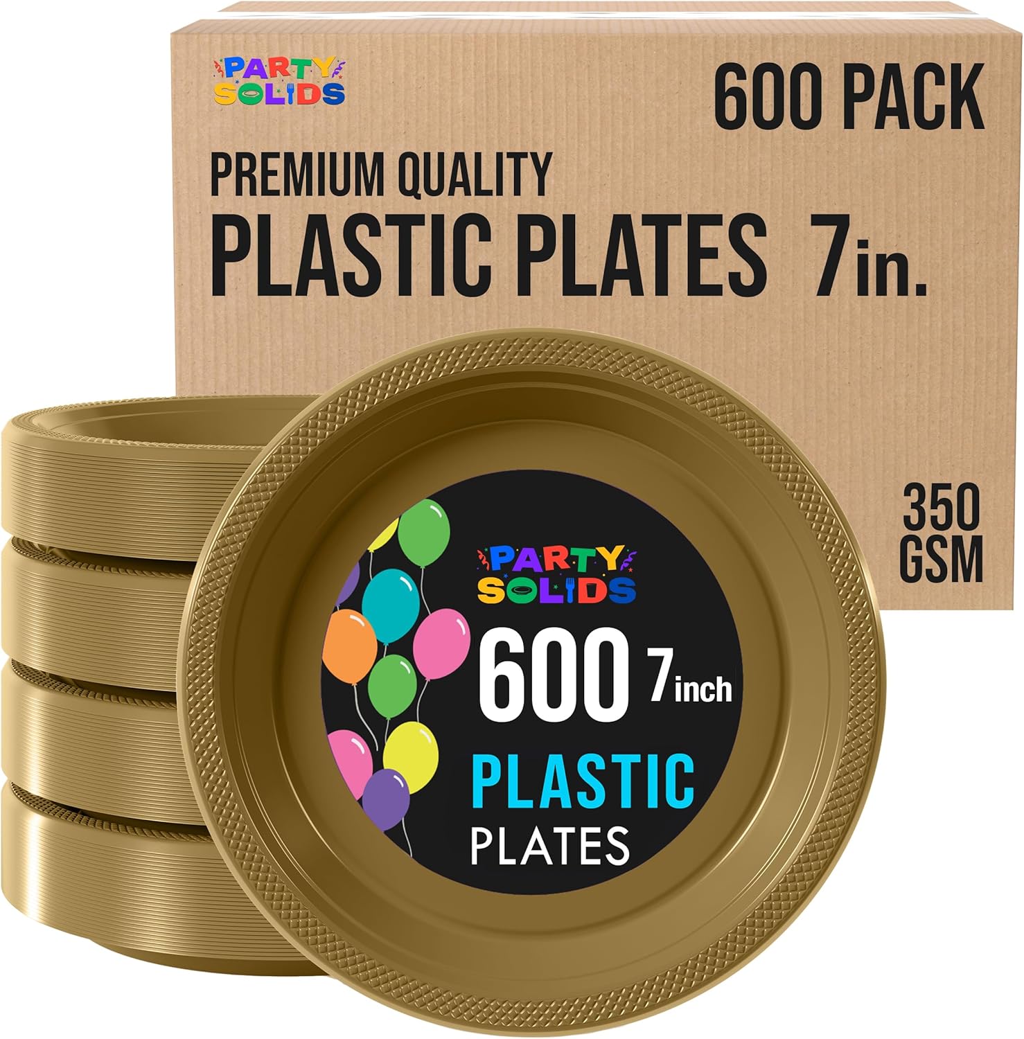 Party Solids Gold Plastic Plates Bulk 7" Gold Disposable Plates For Party Supplies 600 Pieces Disposable Dinner Plate Heavy Duty 350 GSM Plate Sets, Plastic Dinnerware Sets