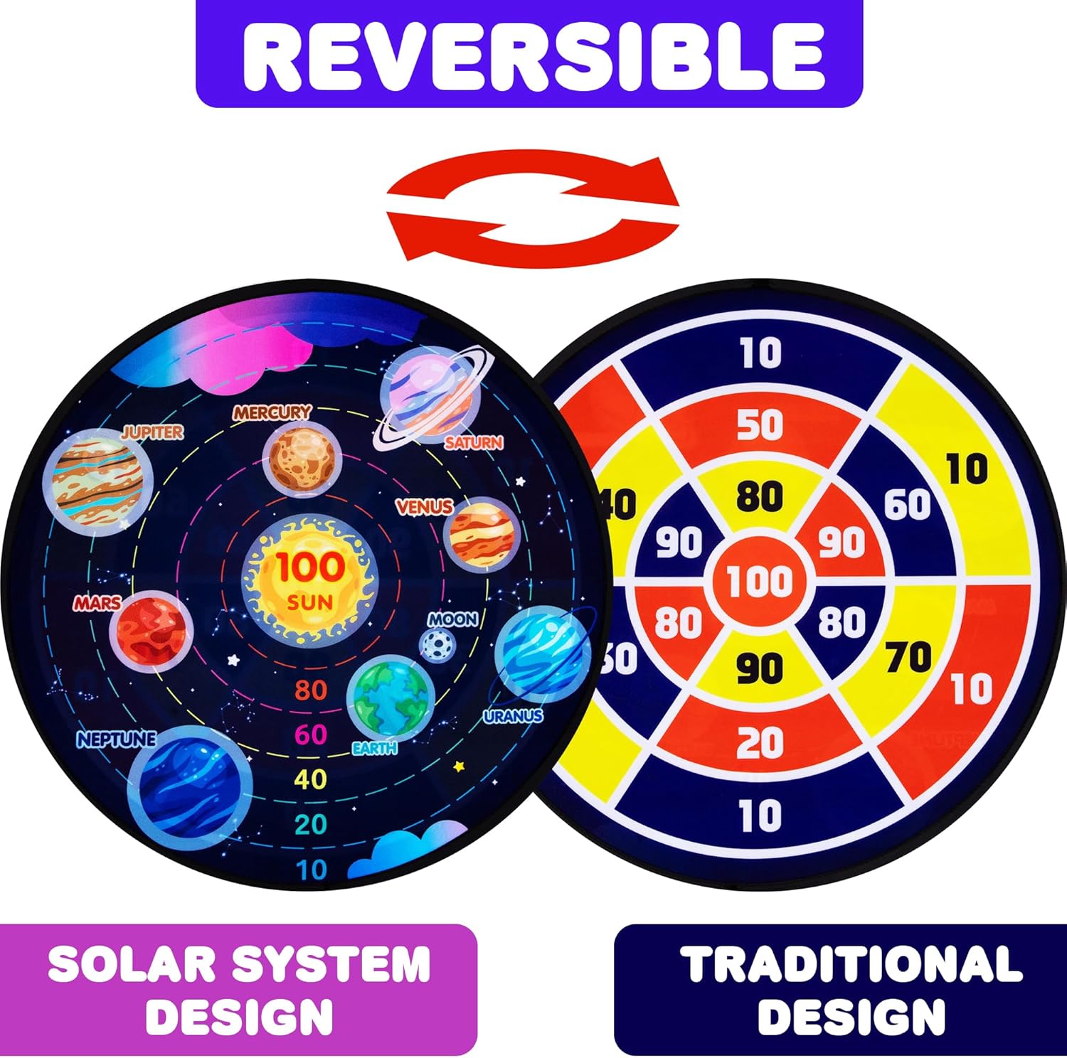 - UNIQUE REVERSIBLE DESIGN: This isn’t just any velcro dart board; it’s reversible. One side has a traditional dart board design, while the other has a striking solar system look. When not in use, the space side will add eye-catching decor to kids’ rooms.
