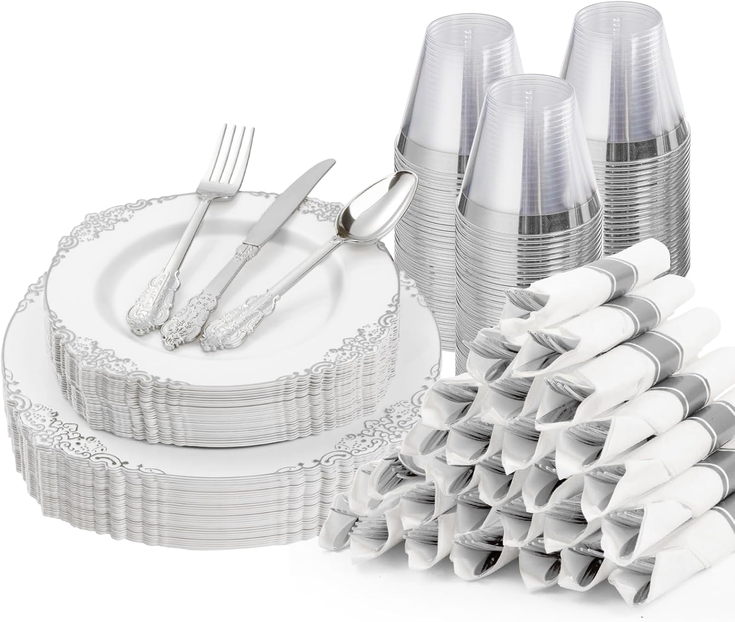 - ELEGANT DESIGN: Our silver plastic dinnerware sets are designed a fancy apperence with vintage gold rim, which is extremely unique and special. The table decorated with this plastic plates disposable is elegant and exquisite, which can always bring surprises to your party and your distinguished guests.