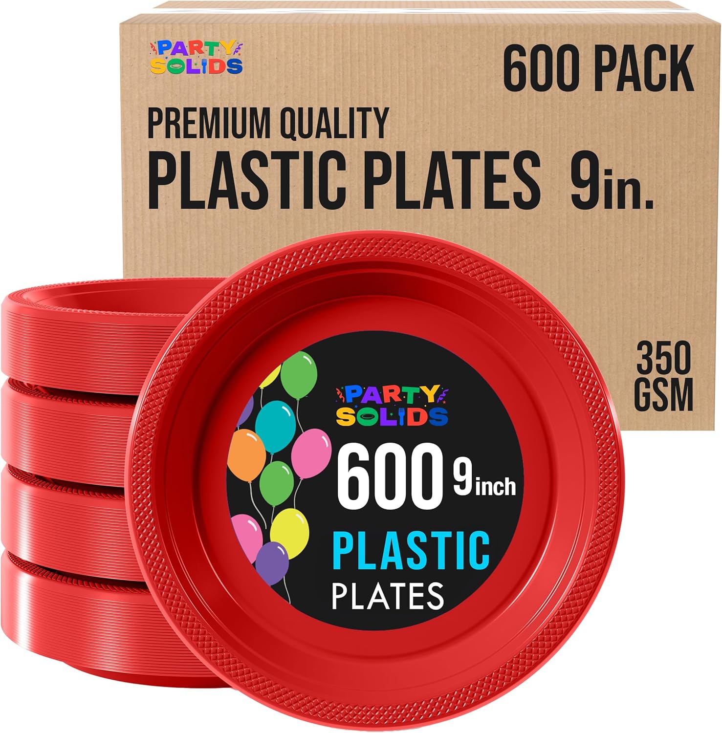 Exquisite Party Solids Red Plastic Plates Bulk 9" Red Disposable Plates For Party Supplies 600 Pcs Disposable Dinner Plate Heavy Duty 350 GSM Plate Sets, Plastic Dinnerware Sets