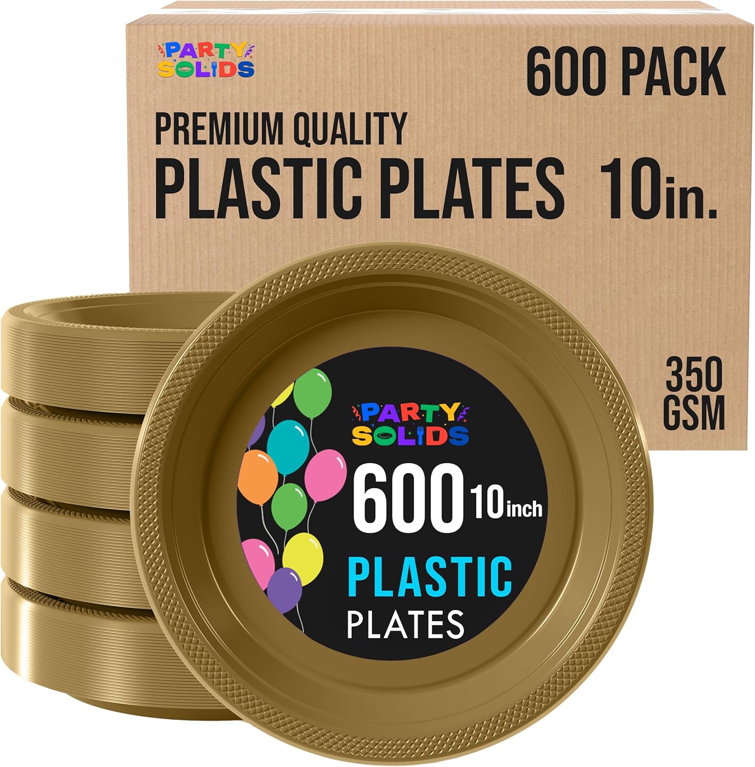 Party Solids Gold Plastic Plates Bulk 10" Gold Disposable Plates For Party Supplies 600 Pieces Disposable Dinner Plate Heavy Duty 350 GSM Plate Sets, Plastic Dinnerware Sets
