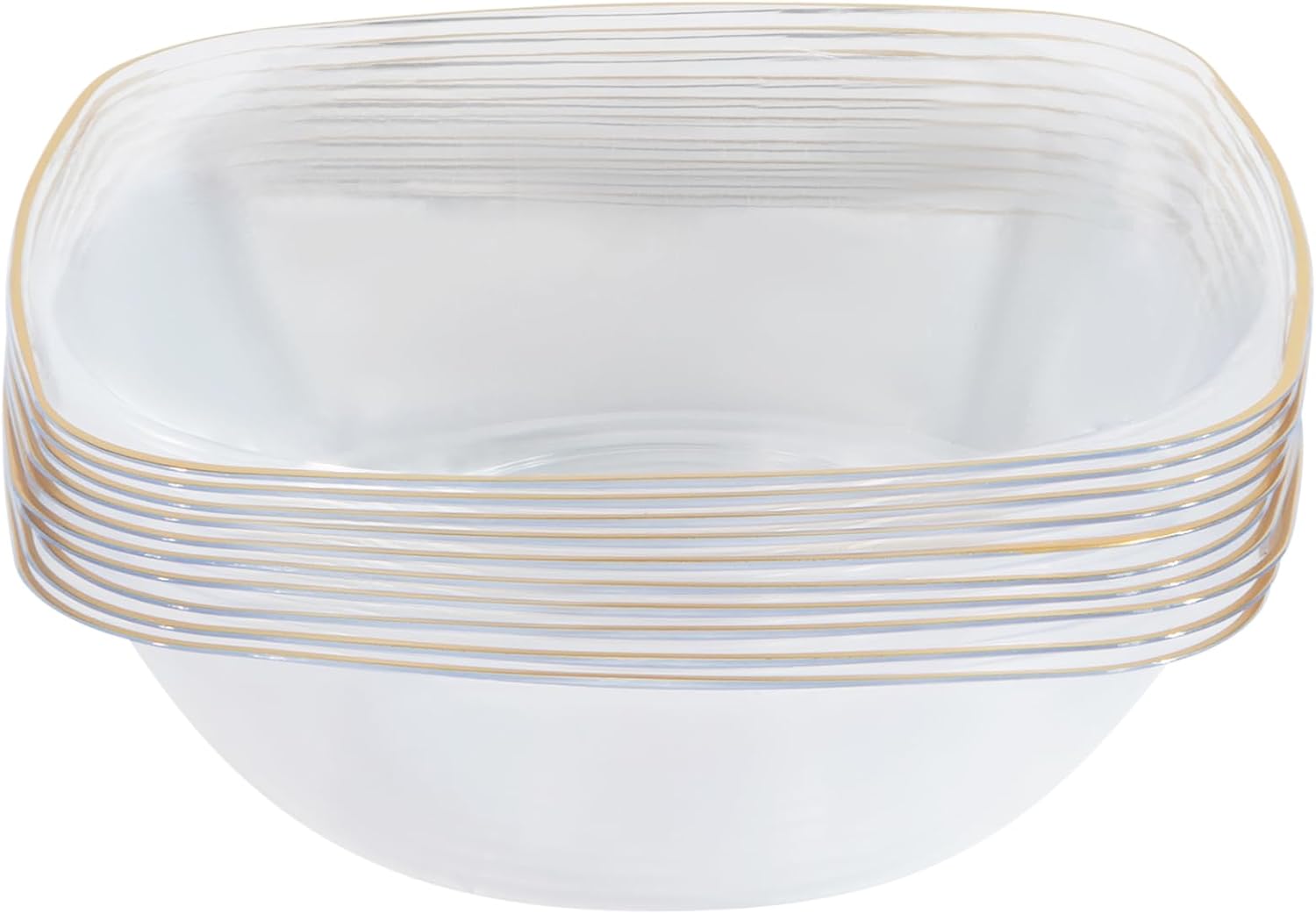 - PLASTICPRO White Plastic Organic Party Square Dessert bowls Clear With Gold Rim Elegant Disposable Tableware Dishes 6 OZ 32 Count