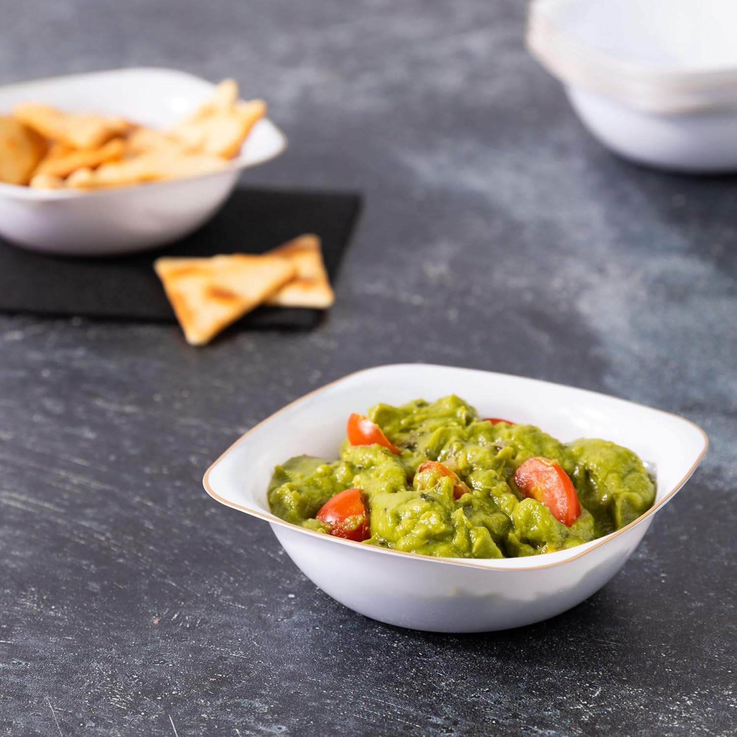 - PLASTICPRO White Plastic Organic Party Square Dessert bowls White With Gold Rim Elegant Disposable Tableware Dishes 6 OZ 32 Count