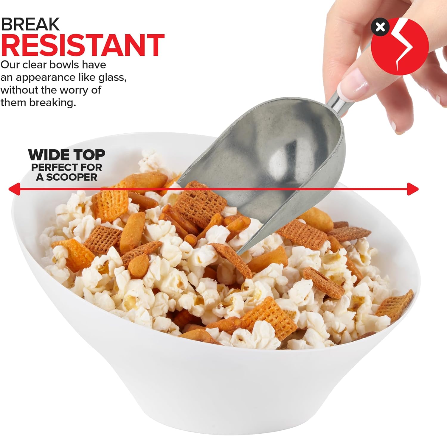 - Elegant & Chic: Our white serving bowls have an appearance like glass, without the worry of them breaking. This angled bowl is perfect for chips n' dip, popcorn, pretzels, mints, and other snacks.