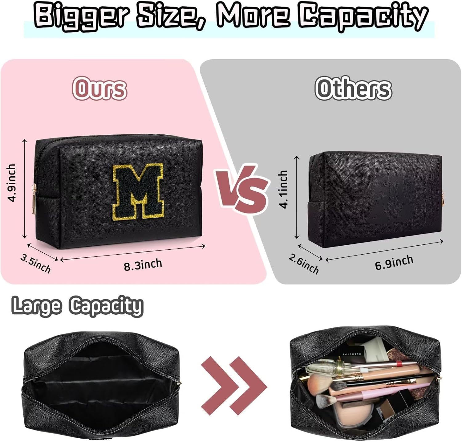 - PERSONALIZED INITIAL PATCH DESIGN: Preppy makeup bag boasts a gold glitter chenille patch that is not only stylish but also skin-friendly and comfortable to touch. The cute monogram patch has a strong personalized style, and it is sewn onto this cute makeup bag to brighten up the look and add a personalized touch