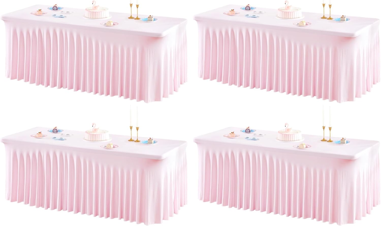 4 Packs Pink Table Clothes for 8 Foot Rectangle Tables, One-Piece Wrinkle Resistant Stretch Spandex Table Covers with Skirt for Event Banquet Wedding Birthday Party