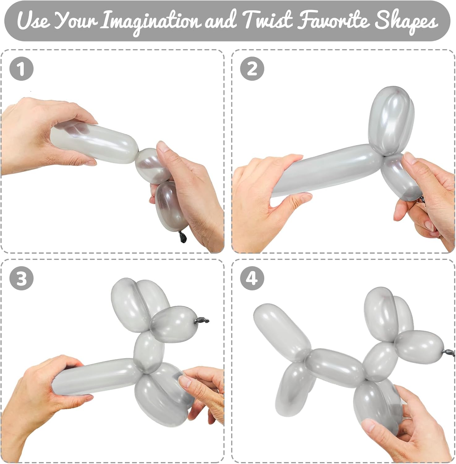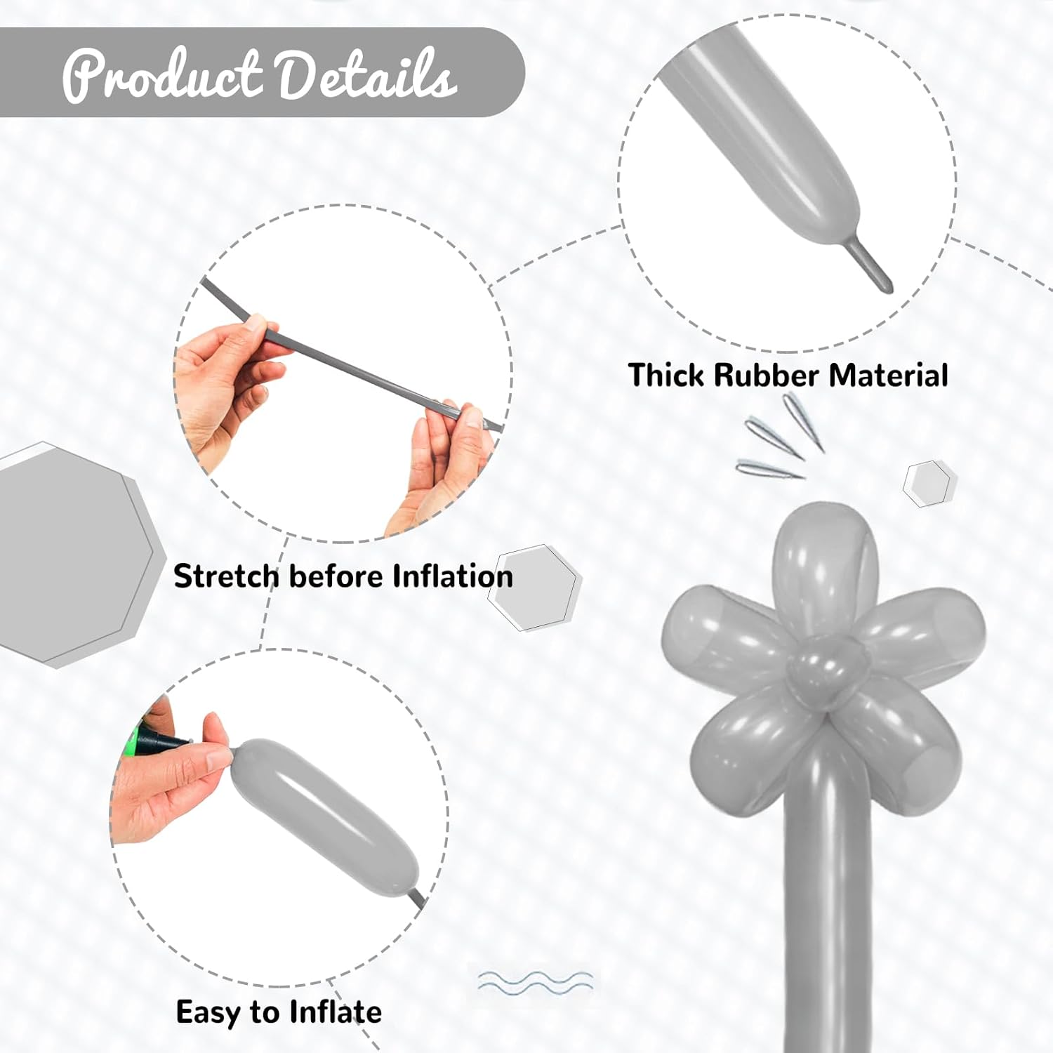 - The package includes:100 Pcs silver grey 260q balloons, to meet your various decoration needs. 260 balloons silver grey can be inflated or filled with helium. Size: 12 inches before inflation, 53-55 inches after inflation, very suitable for professional balloon artists.