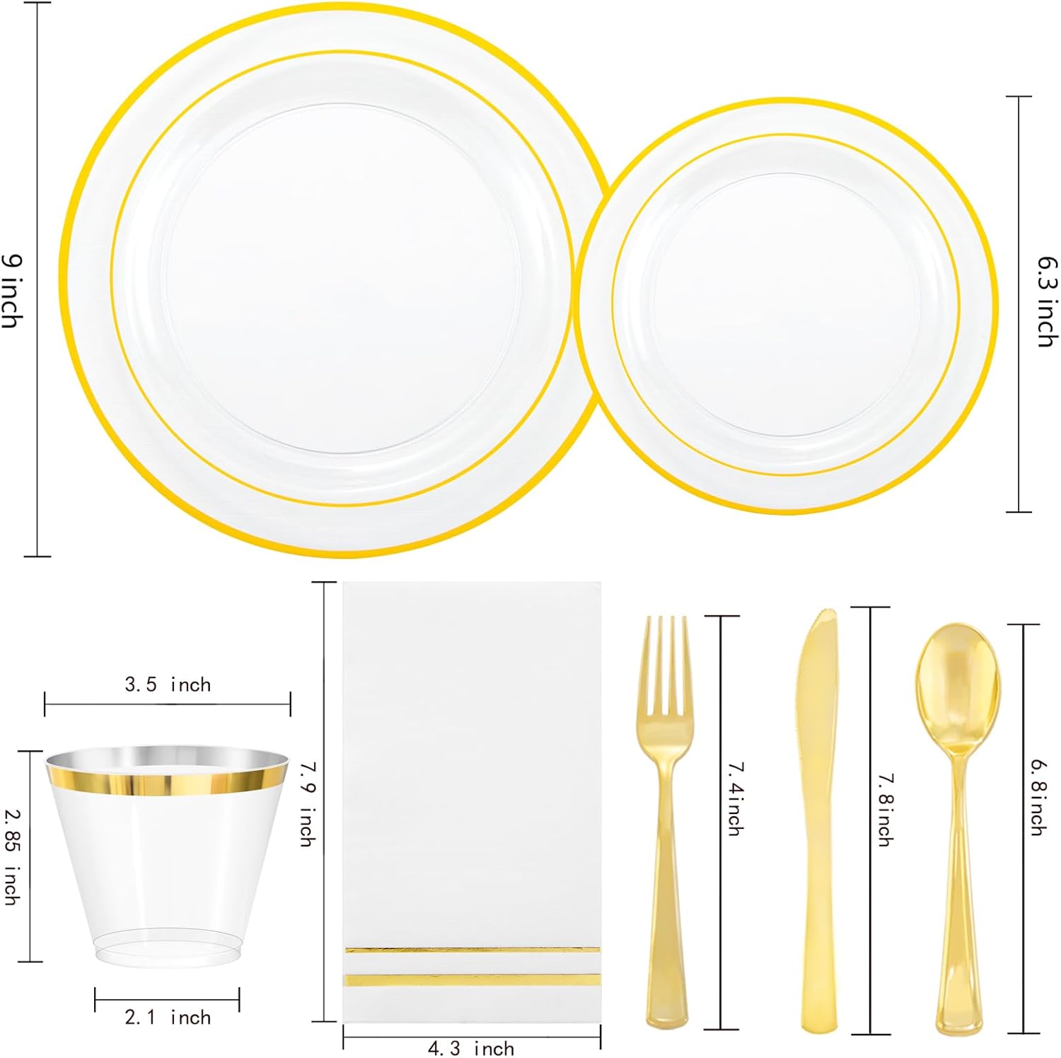 - ELEGANT DESIGN: The unique design of these clear plastic plates with gold trim can better meet customers' needs. Whether it's an everyday meal or a special occasion, plastic dinnerware set make a unique visual statement.
