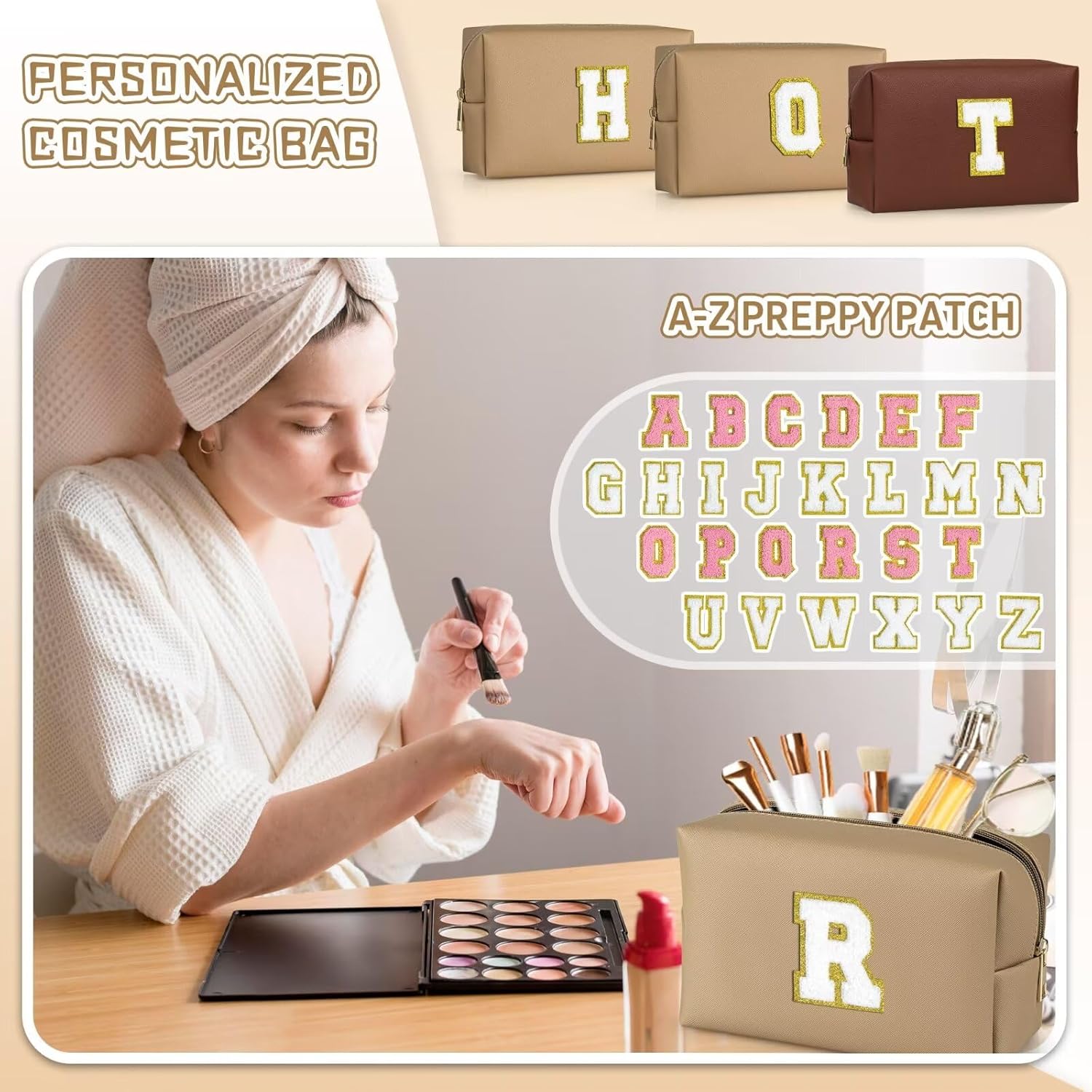 - PERSONALIZED INITIAL PATCH DESIGN: Preppy makeup bag boasts a gold glitter chenille patch that is not only stylish but also skin-friendly and comfortable to touch. The cute monogram patch has a strong personalized style, and it is sewn onto this cute makeup bag to brighten up the look and add a personalized touch
