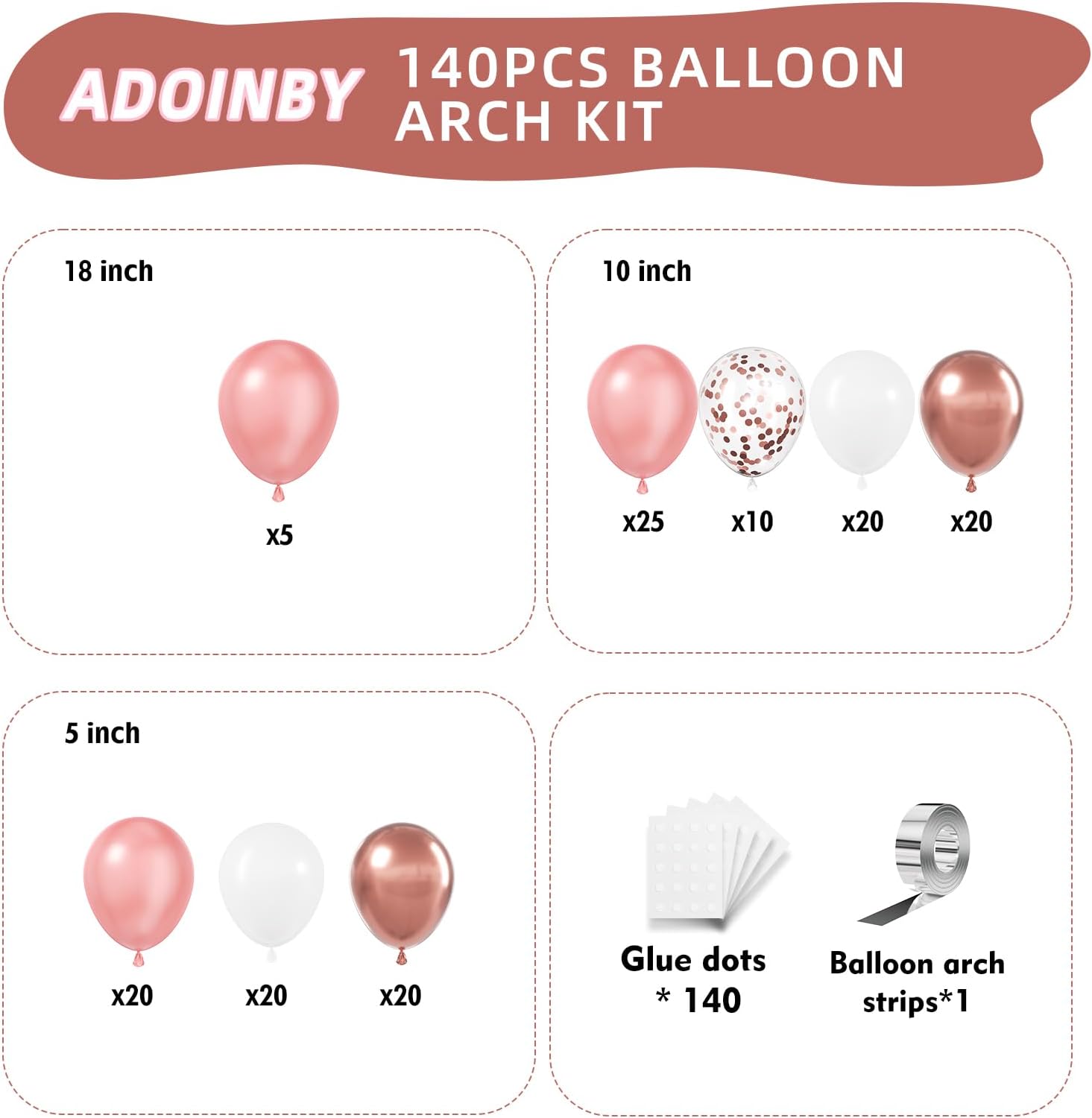 - ๐ใRose Gold and White Balloon Garland Arch Kitใ:Include 18''(Rose Gold balloons 5),10''(Metallic Rose Gold balloons 20, Rose Gold balloons 25, White balloons 10, Rose Gold confetti balloons 10), 5''(Metallic Rose Gold balloons 20, Rose Gold balloons 20, White balloons 20),16FT garland strip x1,140 dots glue.