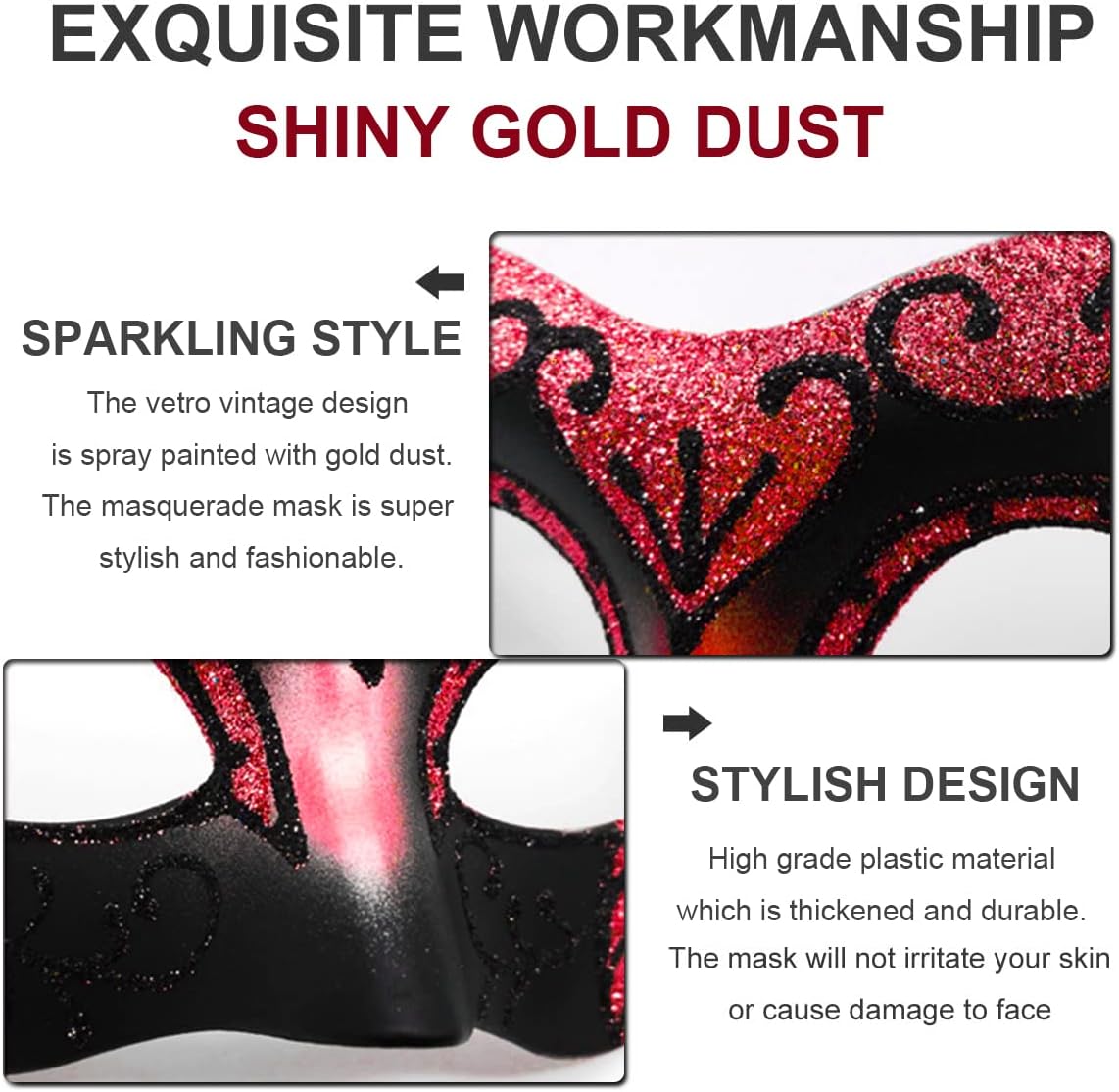 - MASQUERADE MASK for Couple: Our masquerade masks are made of thickened and lightweight great quality plastic which is designed perfectly for all party balls.The mask is unique painted by gold dust,which is shiny and sparkling.The color will not chip off or fad off easily and the stylish and fashionable style is attracive and cool.