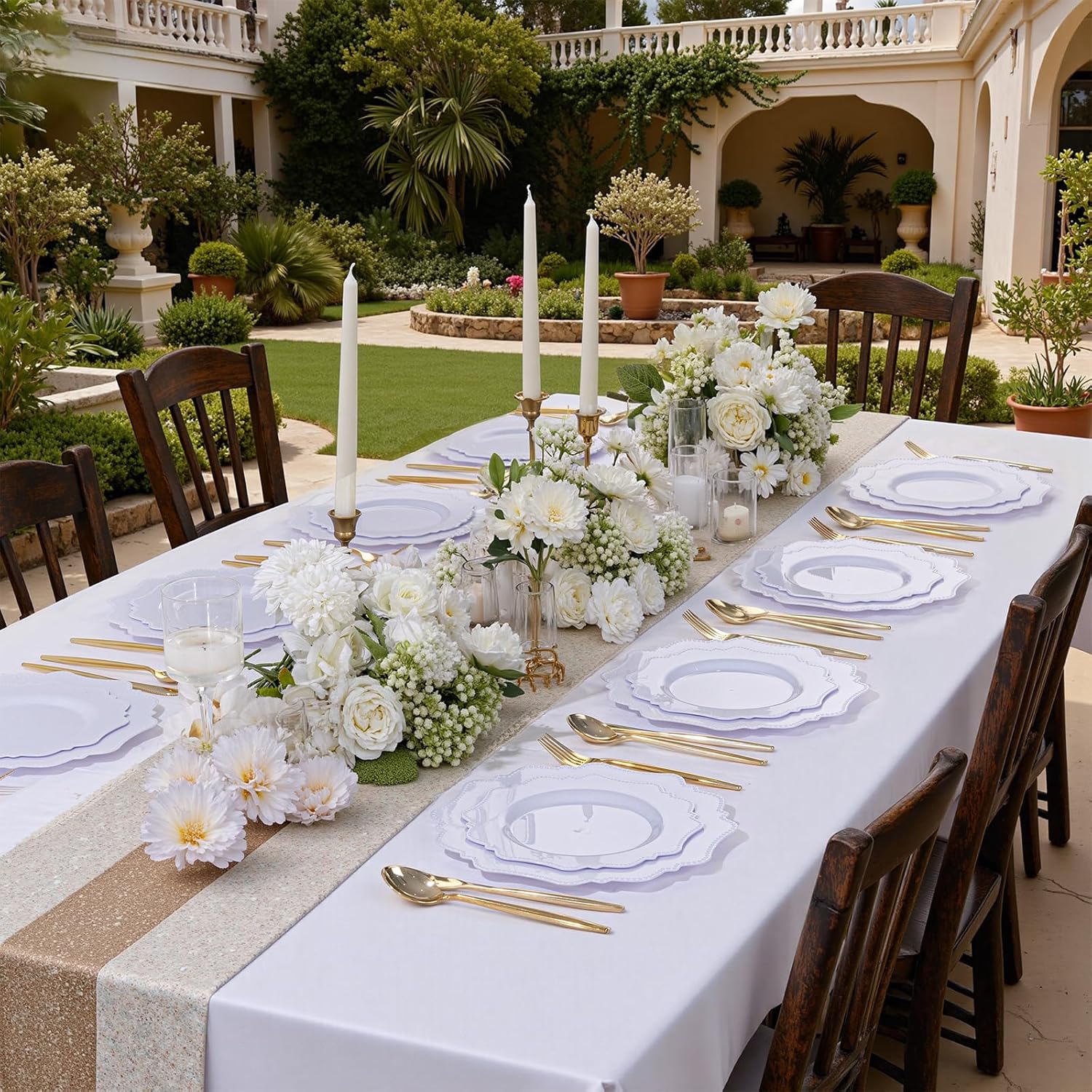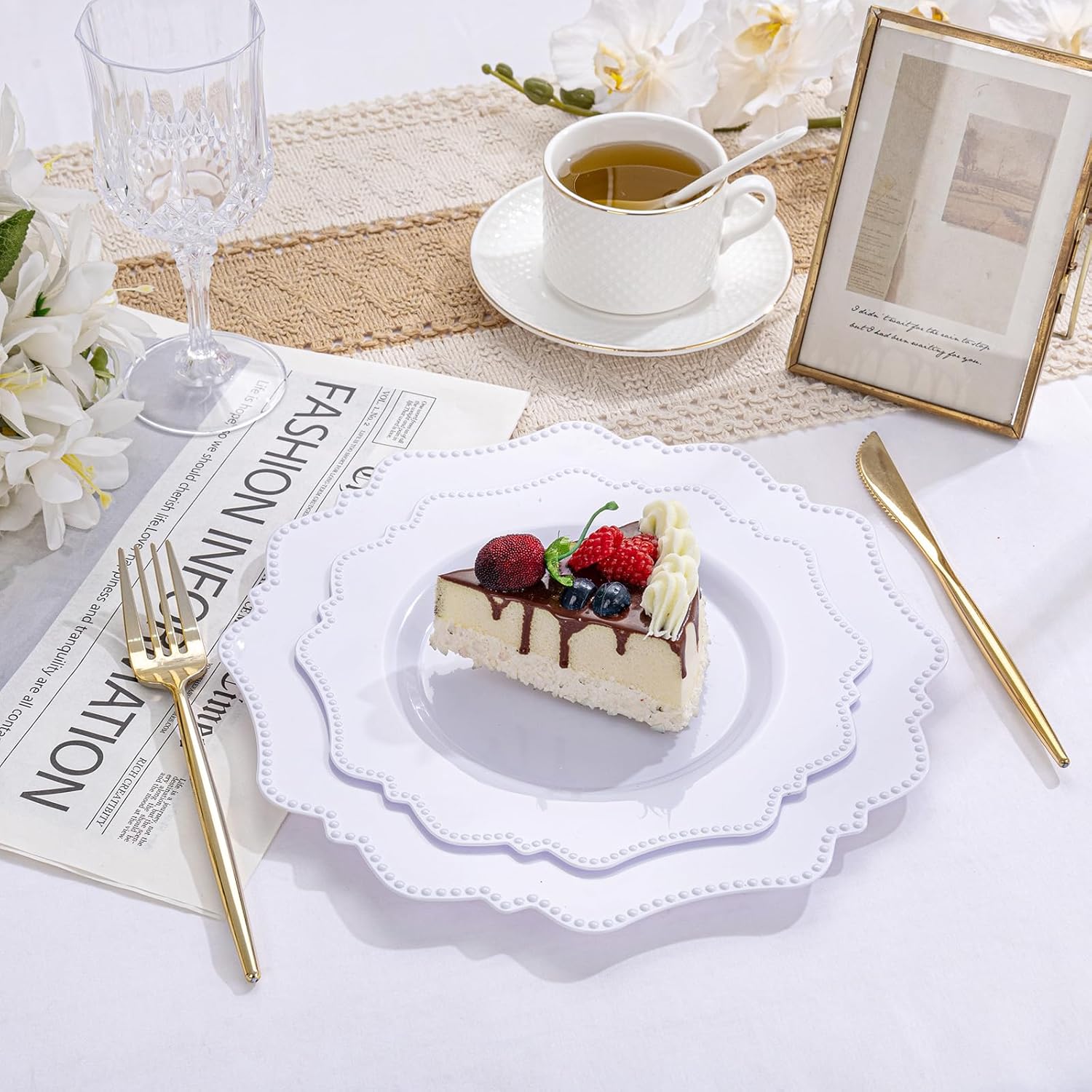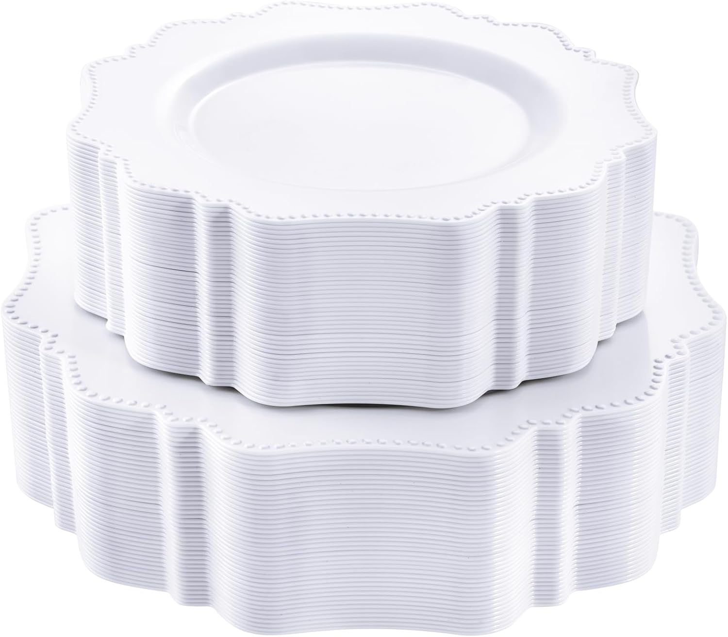 COLOSUS 100 pcs White Plastic Plates Set,Fancy Beaded Plates-European Retro plates include 50 dinner plates and 50 dessert plates,Plastic Disposable plates for Halloween,Thanksgiving,BBQ and Party