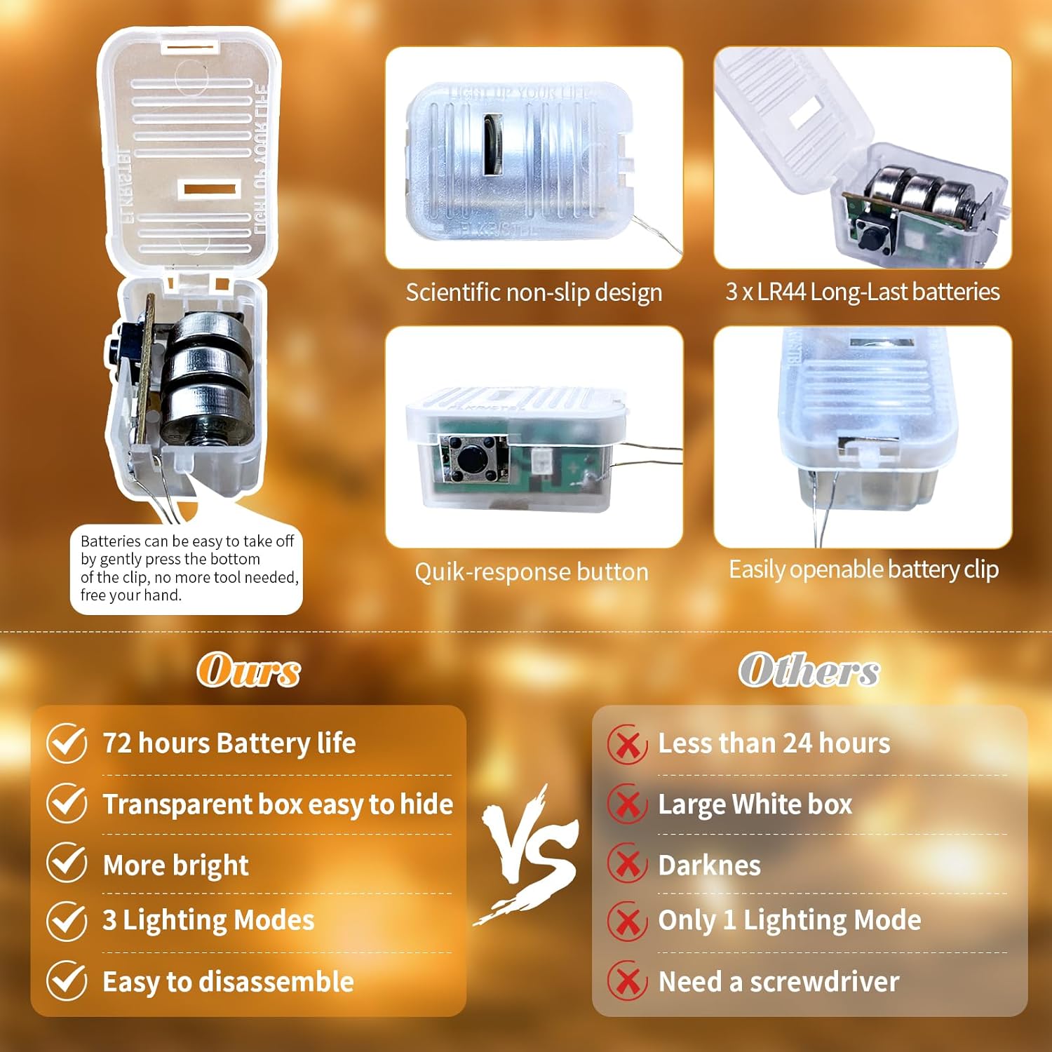 - PREMIUM QUALITY AND LONG LAST LIFE: 12 pack in a box, each twinkle lights made of high quality durable 7 feet long flexible silver wire, and 20 energy-efficient mini led fairy lights, 4 inch distance between each led moon lights. This fairy lights battery operated by 3 x LR44 batteries (included), which can provide 76 hours life. This Christmas lights is perfect for both everyday decorations as well as holiday decor (Batteries need to be replaced when the string get dims)
