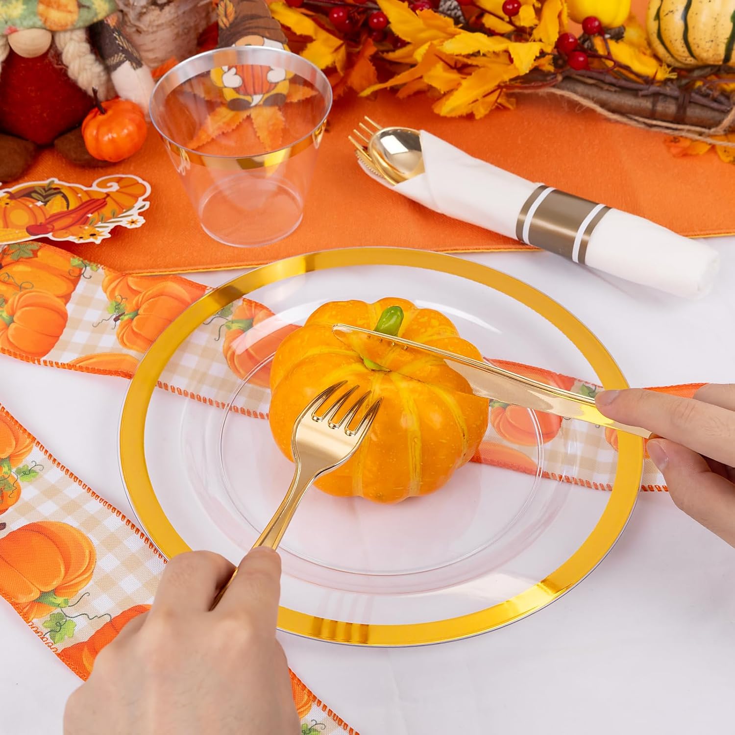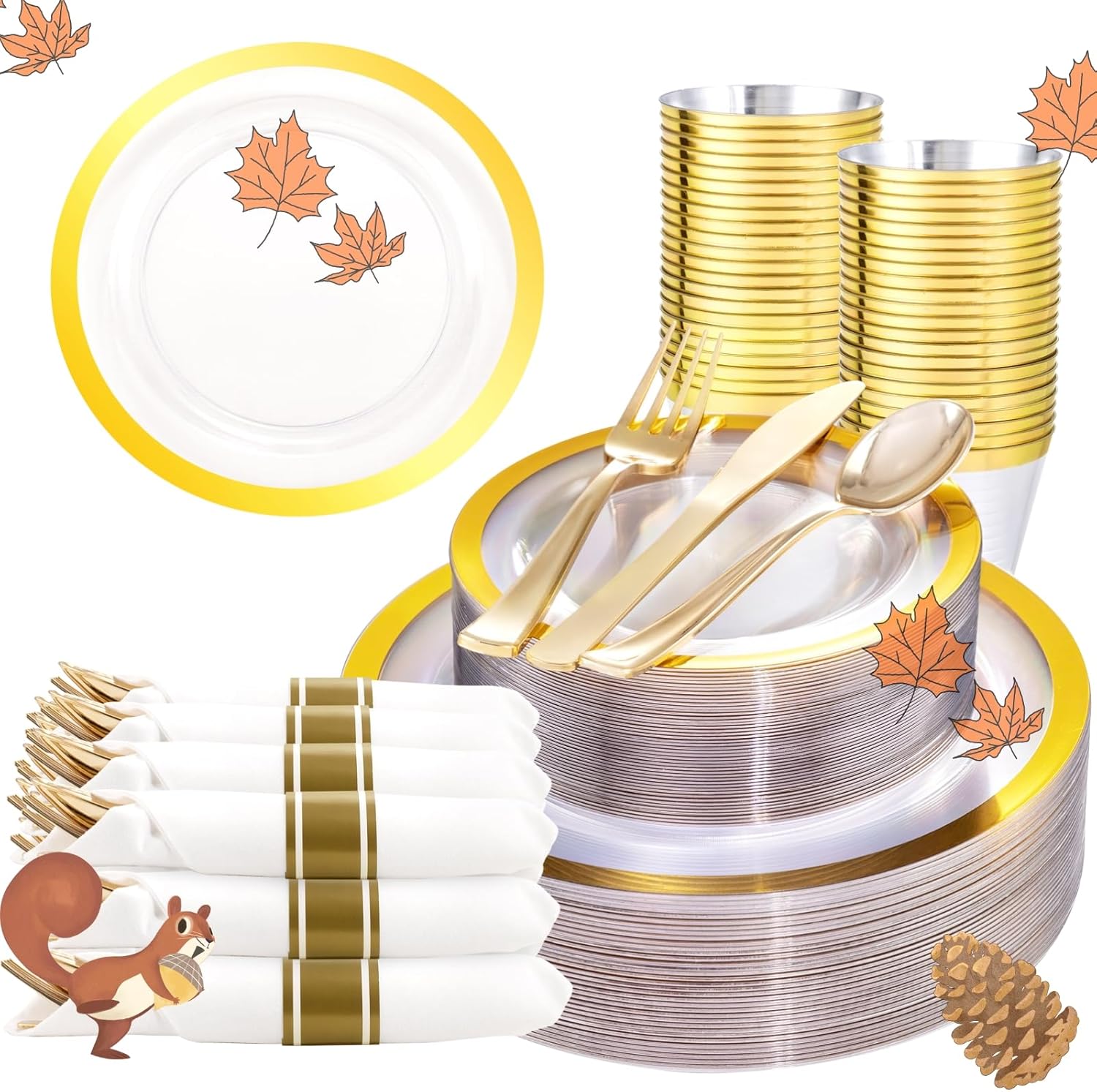 Liacere 350PCS Clear Gold Plastic Plates for 50 Guests Dinnerware Include 100 disposable Plates 150 Gold Silverware 50Napkins for Party&Wedding&Thanksgiving&Fall Decor