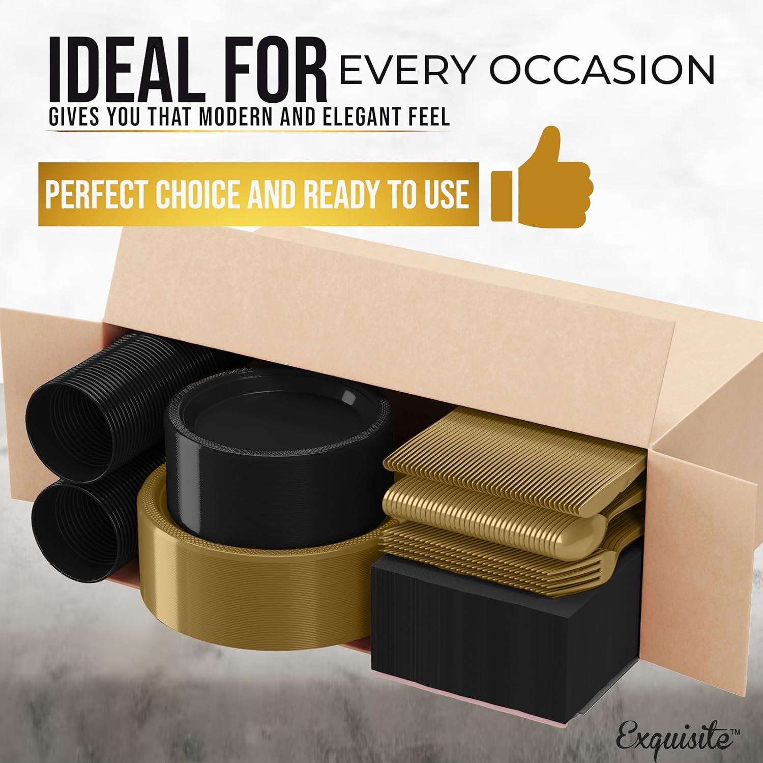 - All Occasions: From family dinners to special events, our black and gold plates will add style to your table. These Black and Gold Plastic Plates for Party sets, complete with napkins, utensils, & plastic cups, are great for parties or daily use. The plates and napkins party supplies are a must-have for a seamless dining experience. Enjoy our disposable black and gold plates set at your next event!