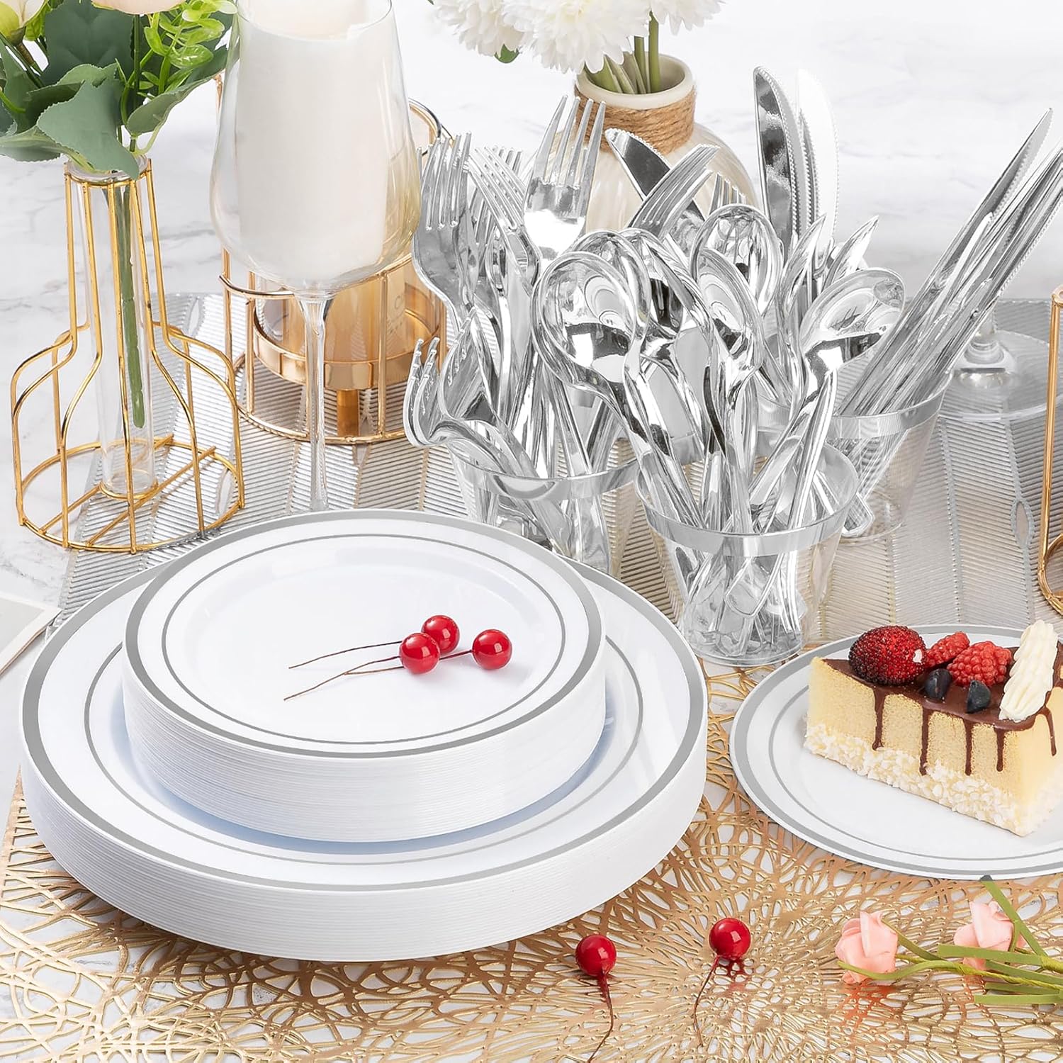 BESTVIP 600PCS Silver Plastic Plate Set (100 Guests), Disposable Plates for Party Wedding Birthday, Dinnerware Set of 200 Plastic Plates, 200 Forks, 100 Spoons, 100 Knives for Christmas