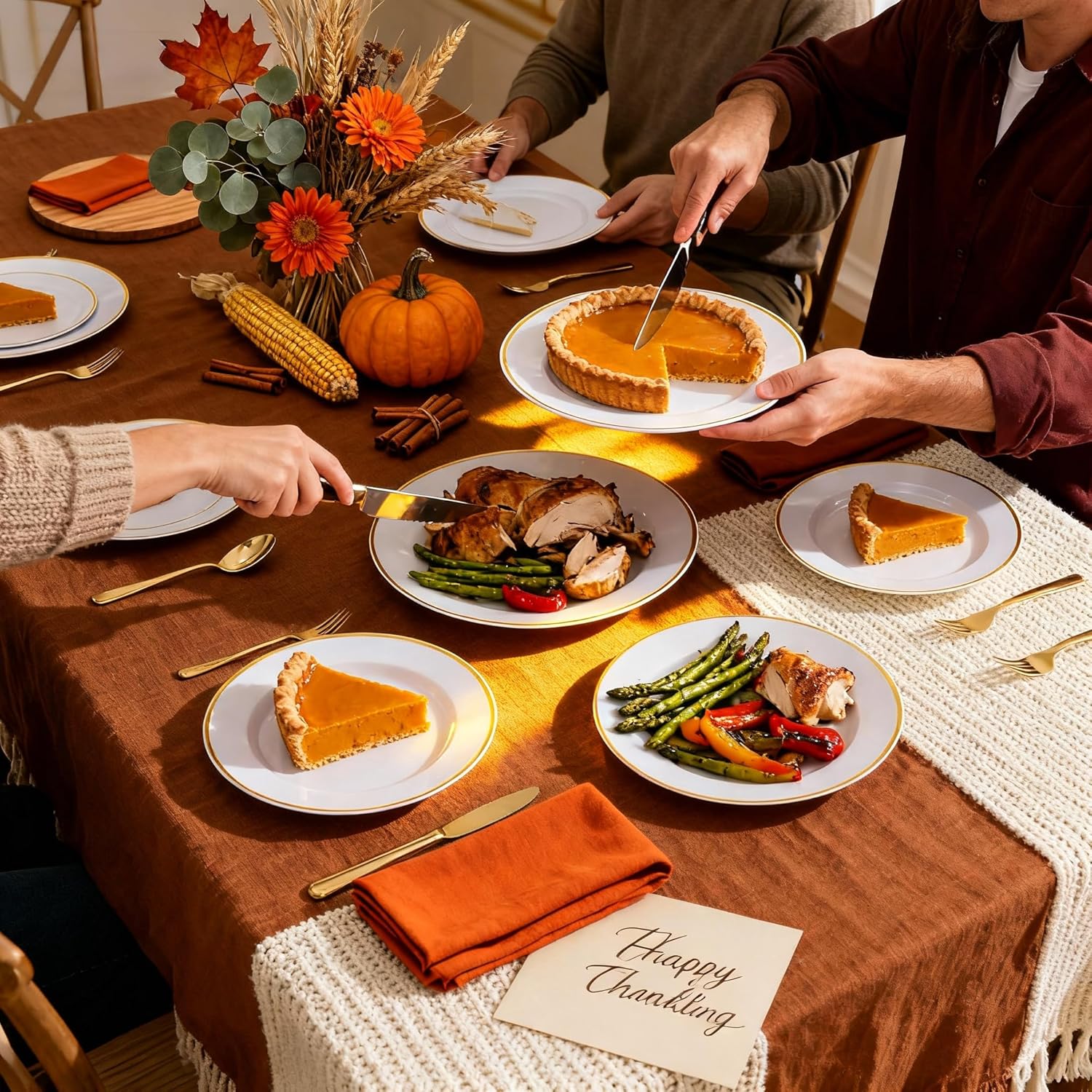 - 【ELEGANT DESIGN】These disposable dinnerware set look premium. White plate with gold lines, simple yet elegant design can match any of your party.