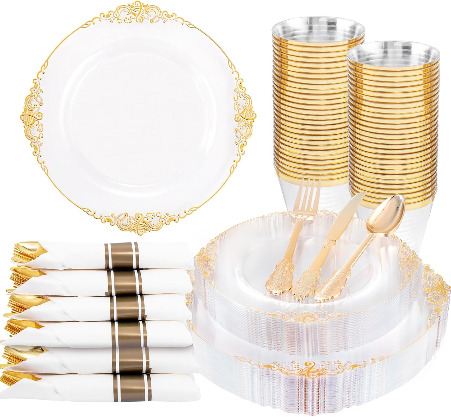 - Great Value: Although intended for single-use, these Baroque-styled clear disposable plates offer a cost-effective alternative compared to traditional porcelain. Catering to gatherings of up to 25 guests, our clear plastic plates include dinner plates and dessert plates, knives, forks, spoons, tissues, and cups, ensuring every guest has everything they need for a delightful dining experience.