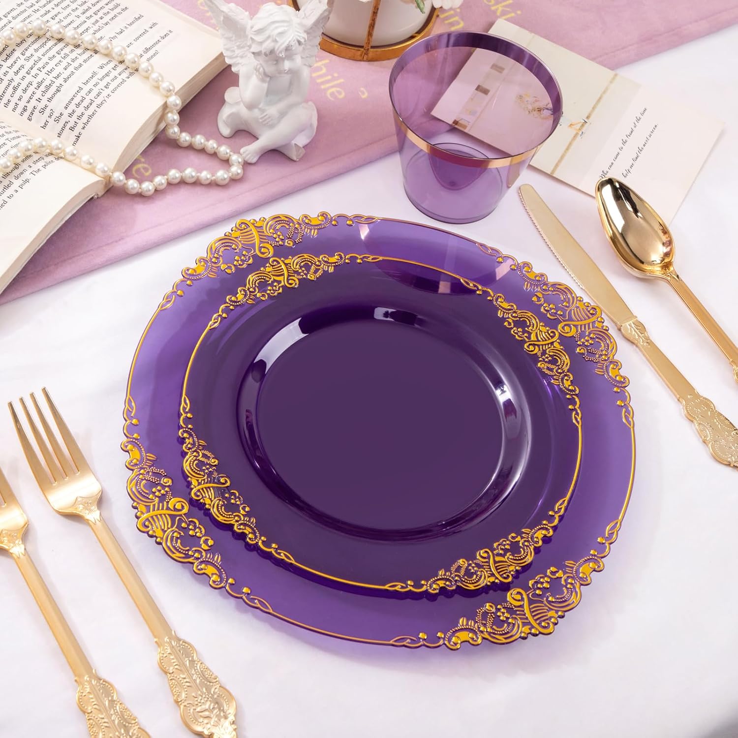- 25 Guest Set: The clear plastic plates include 25 dinner plates, 25 salad plates, 25 knives, 25 forks, 25 spoons, 25 cups, 25 napkins. Purple disposable plates are packed in a solid gift box. The set of gold party plates will allow you to entertain 25 guests.