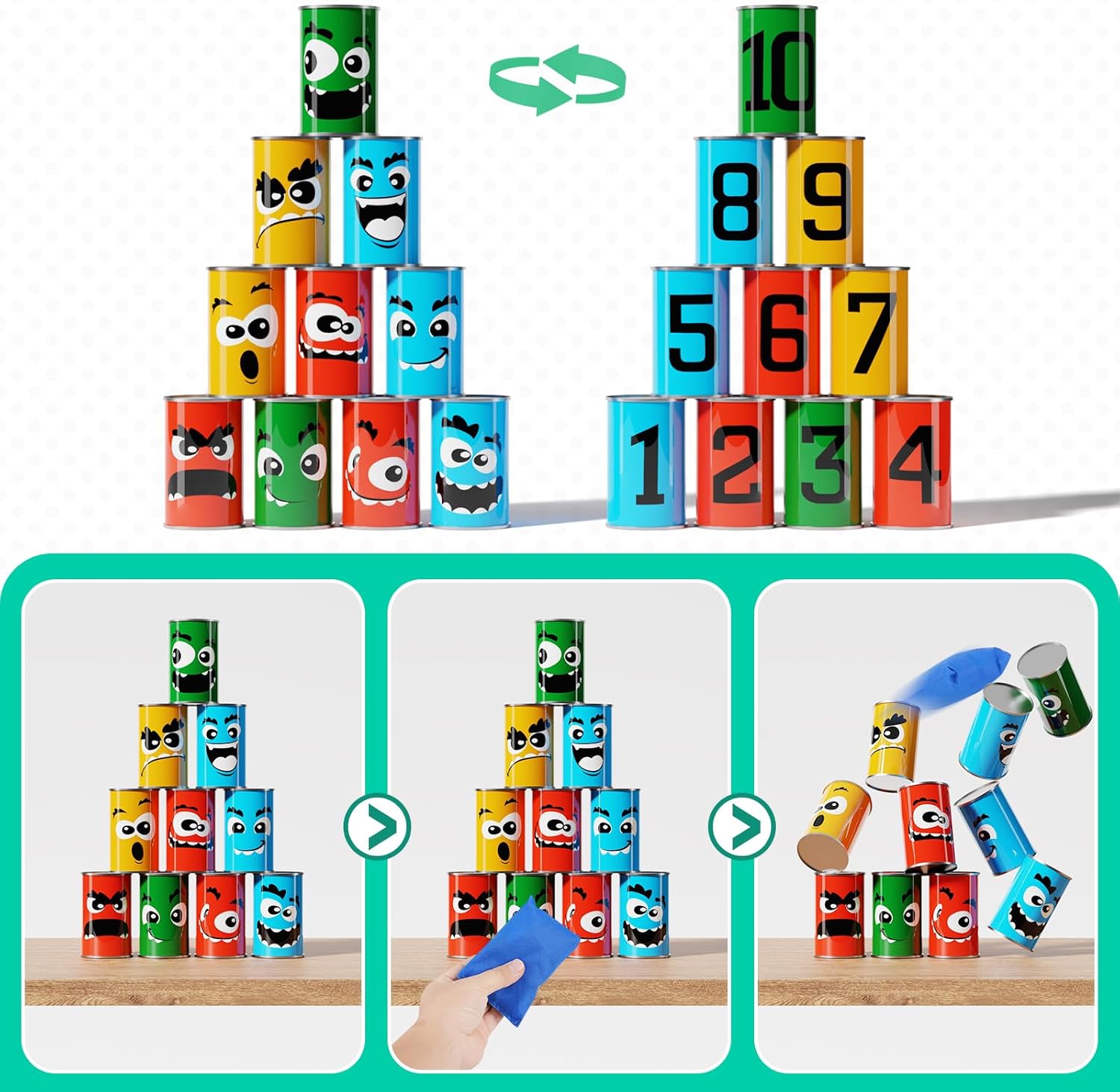 - ❤ Bean Bag Toss Games: Just stack these carnival cans in a pyramid and knock them down by throwing bean bags, the one with the most knocked down cans wins, or use the numbers on the back of each can to calculate the total of knocked down cans wins! So this may also become an exciting and inviting way for kids to learn numbers, simple addition.