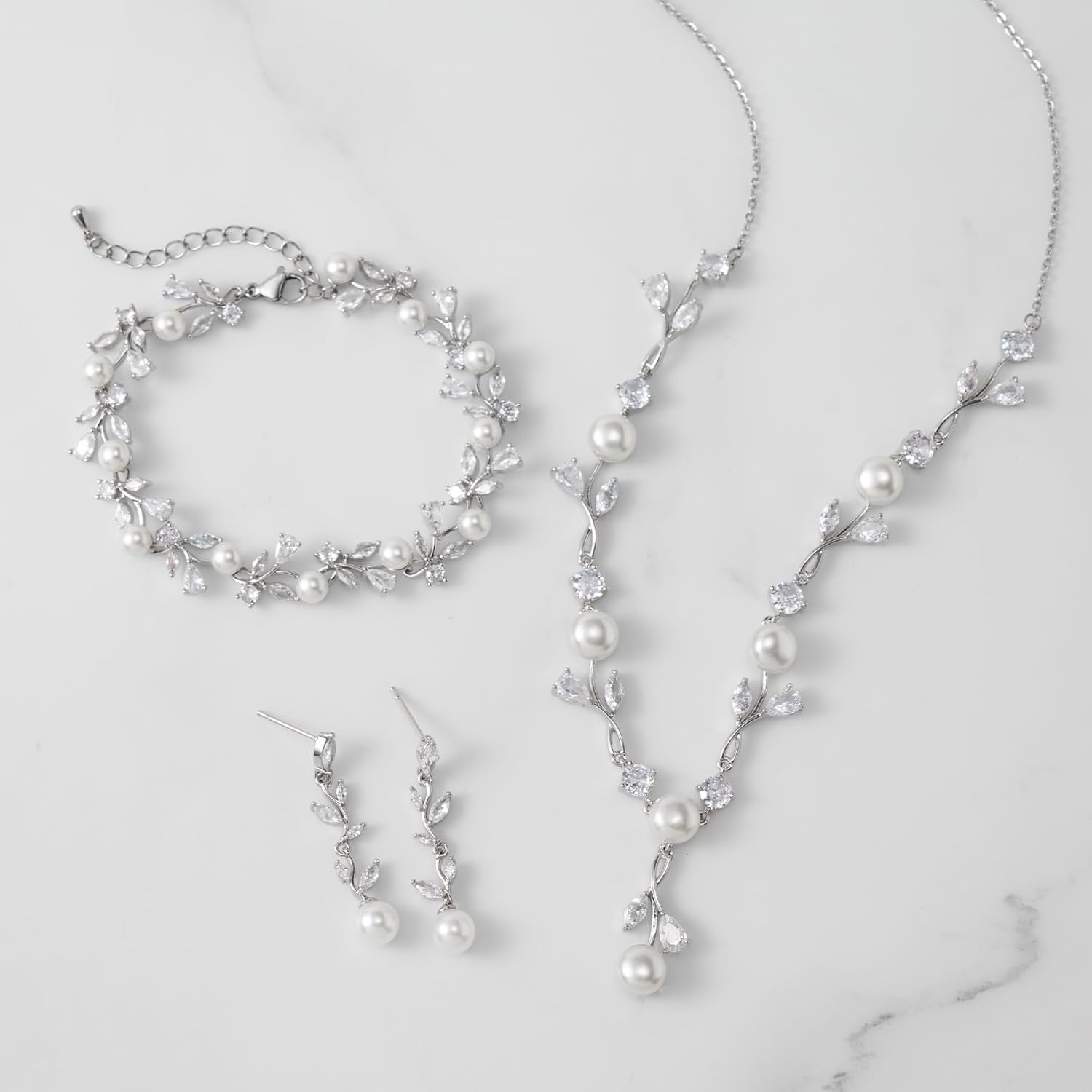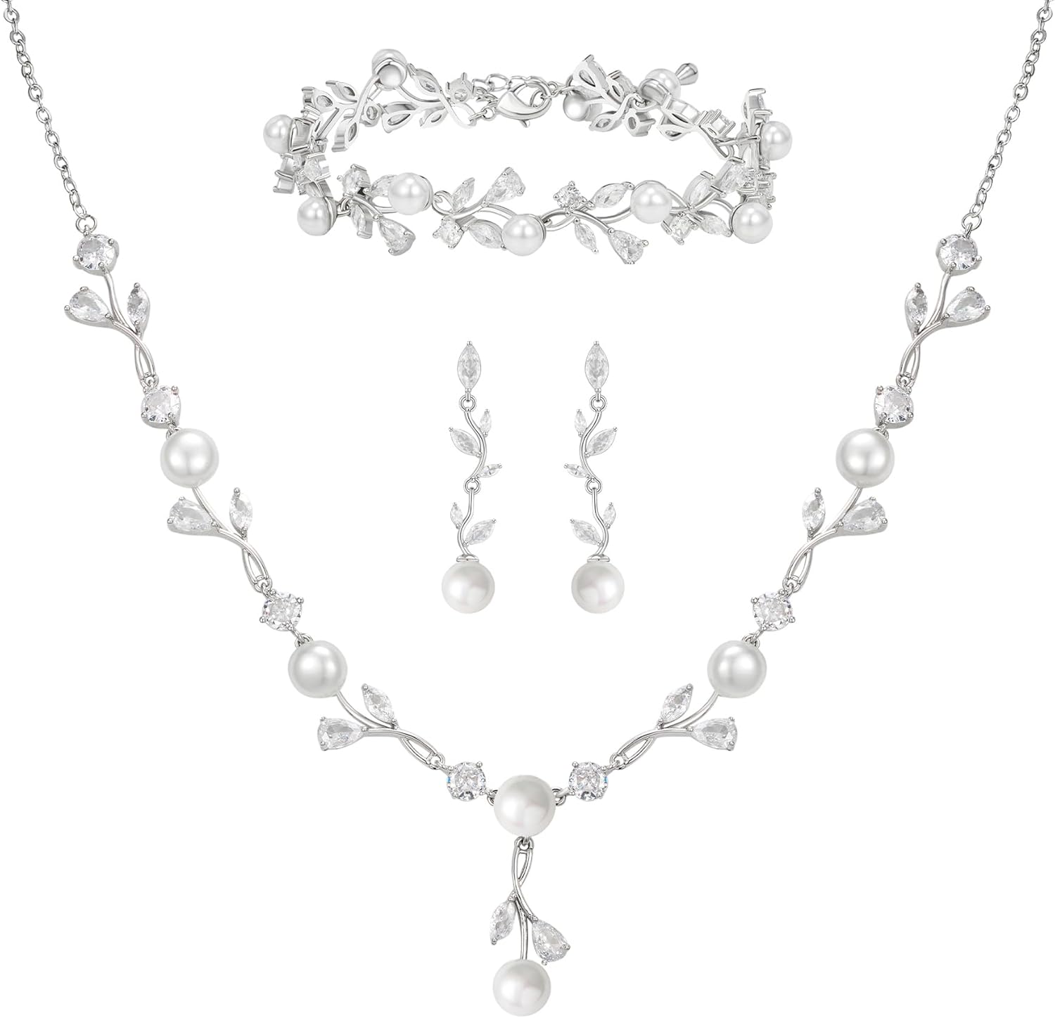 SWEETV Jewelry Set for Bride Women, Cubic Zirconia Pearl Bridal Earrings Necklace Bracelet Set, Bridal Jewelry Set for Wedding Prom