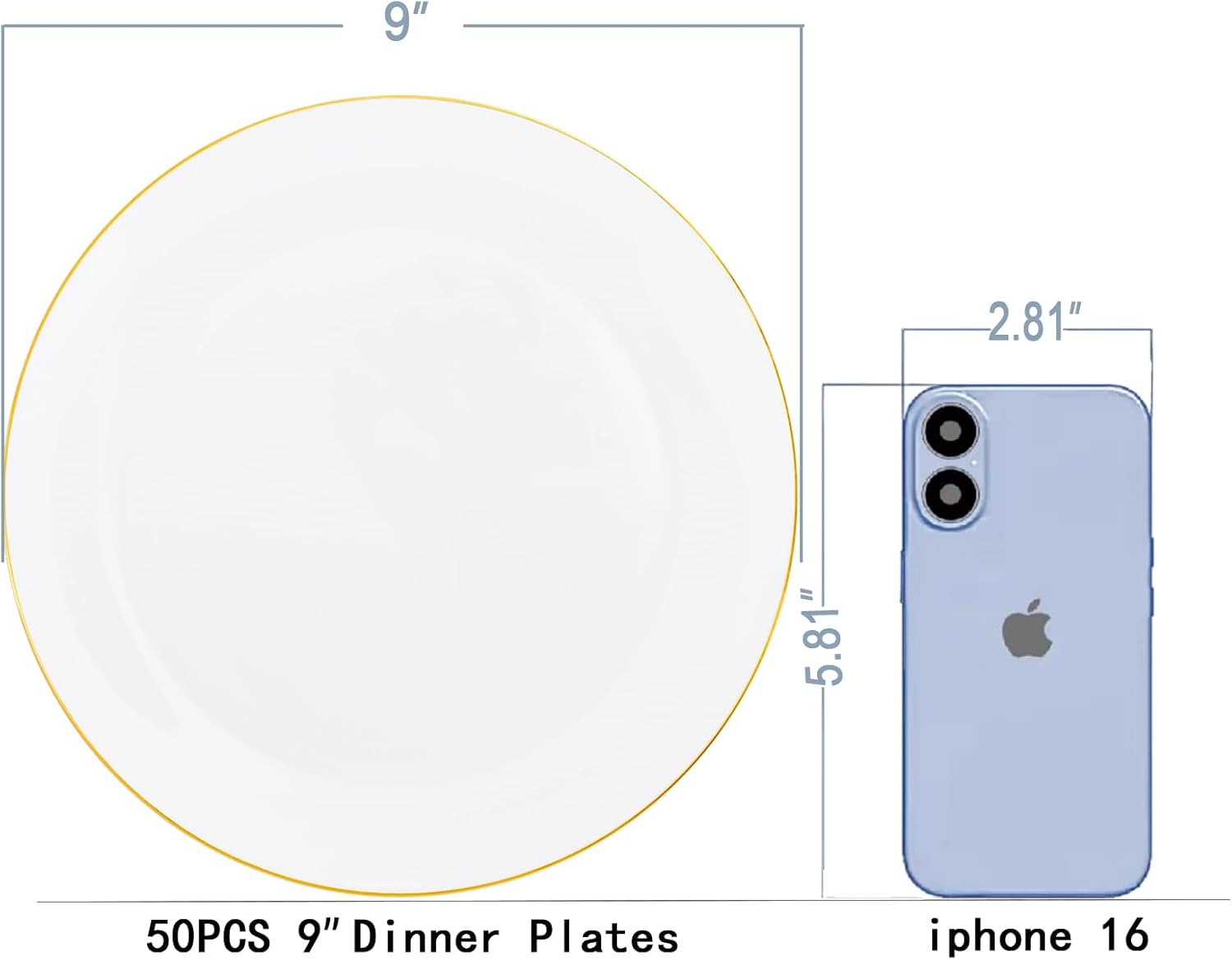 Festiva 50Pcs Gold Plastic Plates - 9 Inch White Plastic Plates with Gold Rim - Disposable Dinner Plates - include 50 salad&pasta Plate Perfect for Party&Wedding&Thanksgiving &Christmas