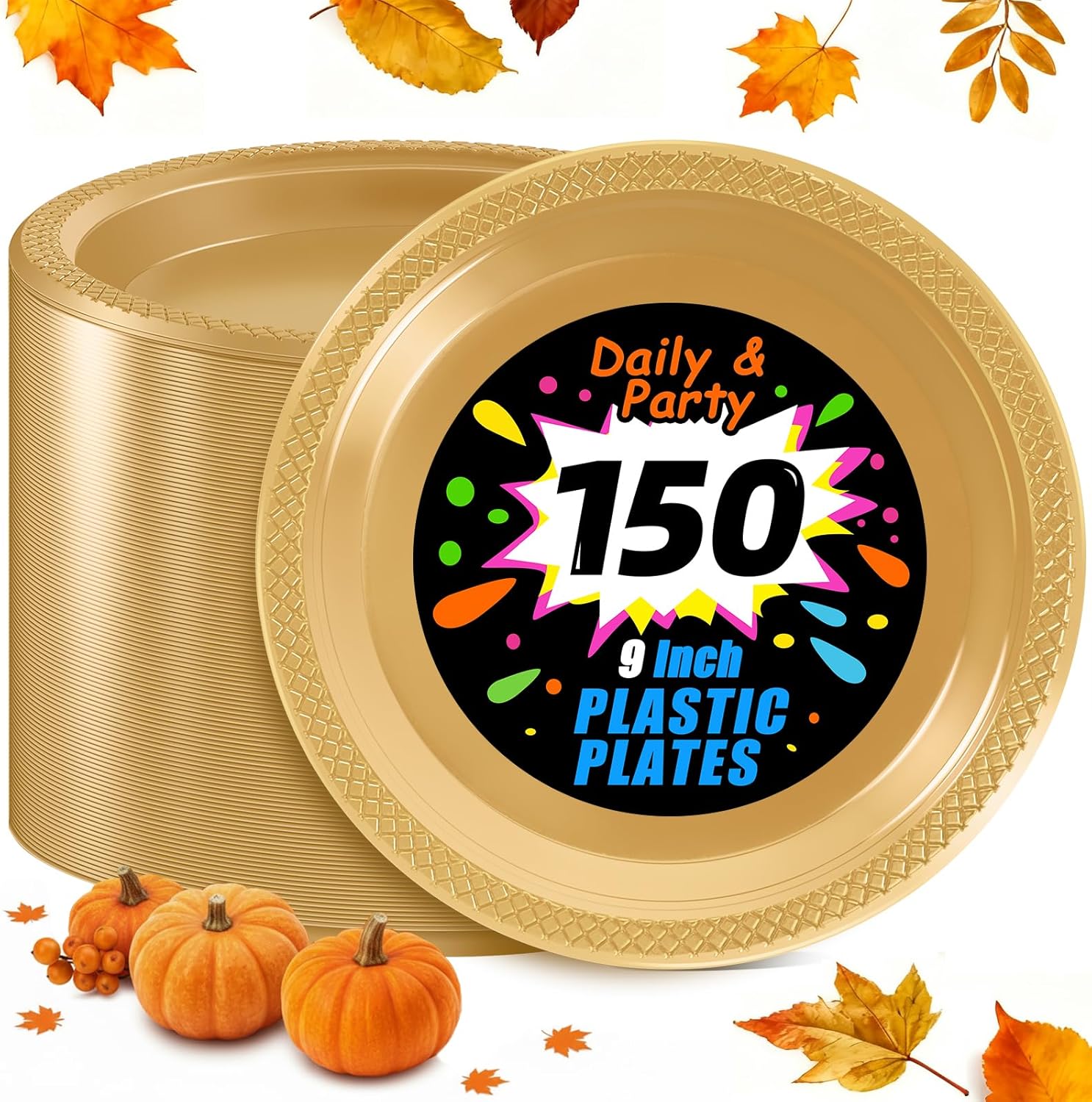 - 【Value and Versatile】Our 150 PCS gold plastic plates 9 inch ensures that you have an ample supply of plates for all your needs. Whether you're using them for a family meals, birthday party, barbecues or a picnic or simply stocking up for everyday use, this pack offers great value for money