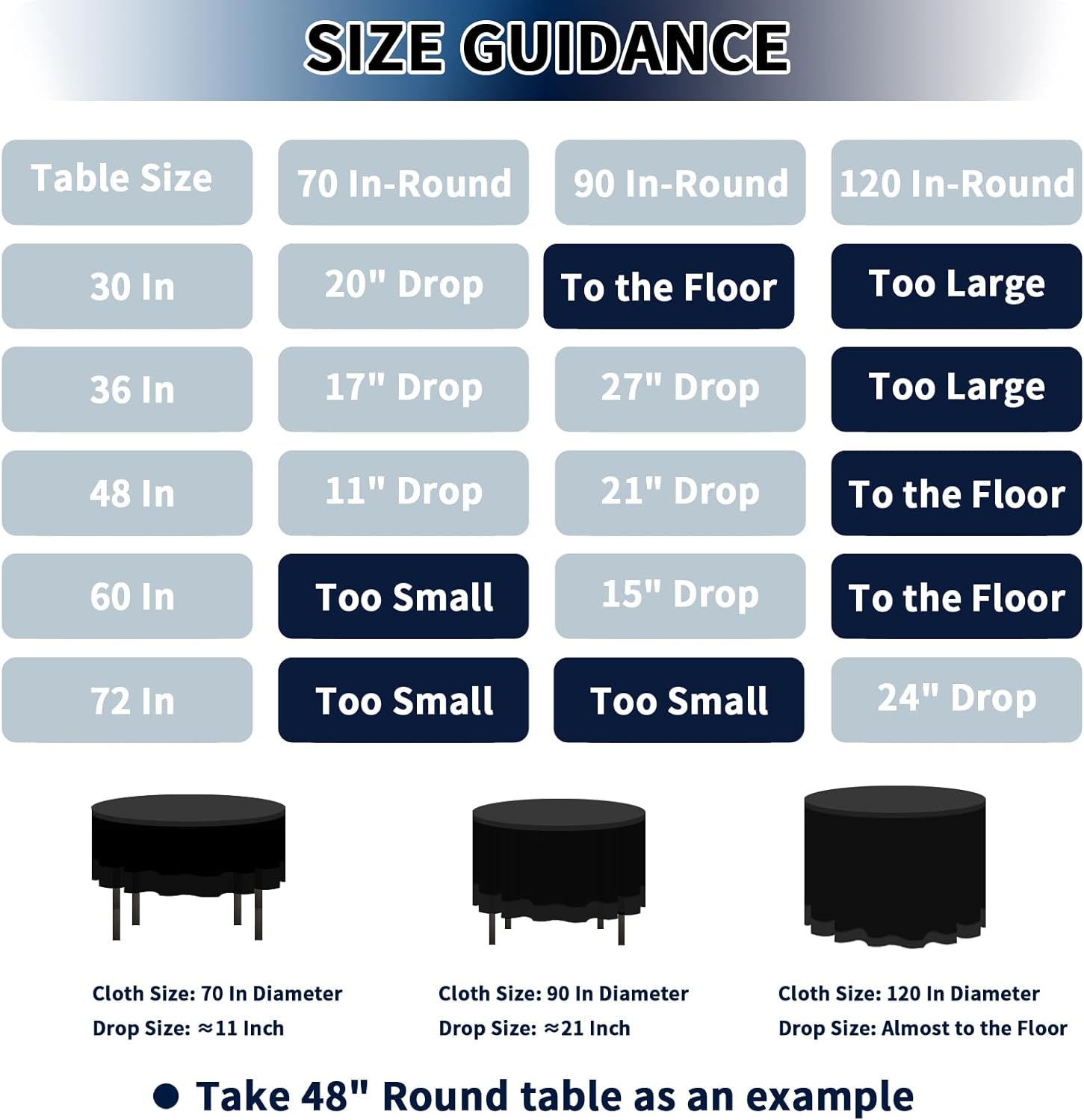 - Package Contents: Each package comes with 6 round tablecloths, each measuring 70 Inch. Our tablecloths are more than just a mere piece of cloth to cover the top of a table, it is the basis for any decor, which dresses up a fresh look for your tables.