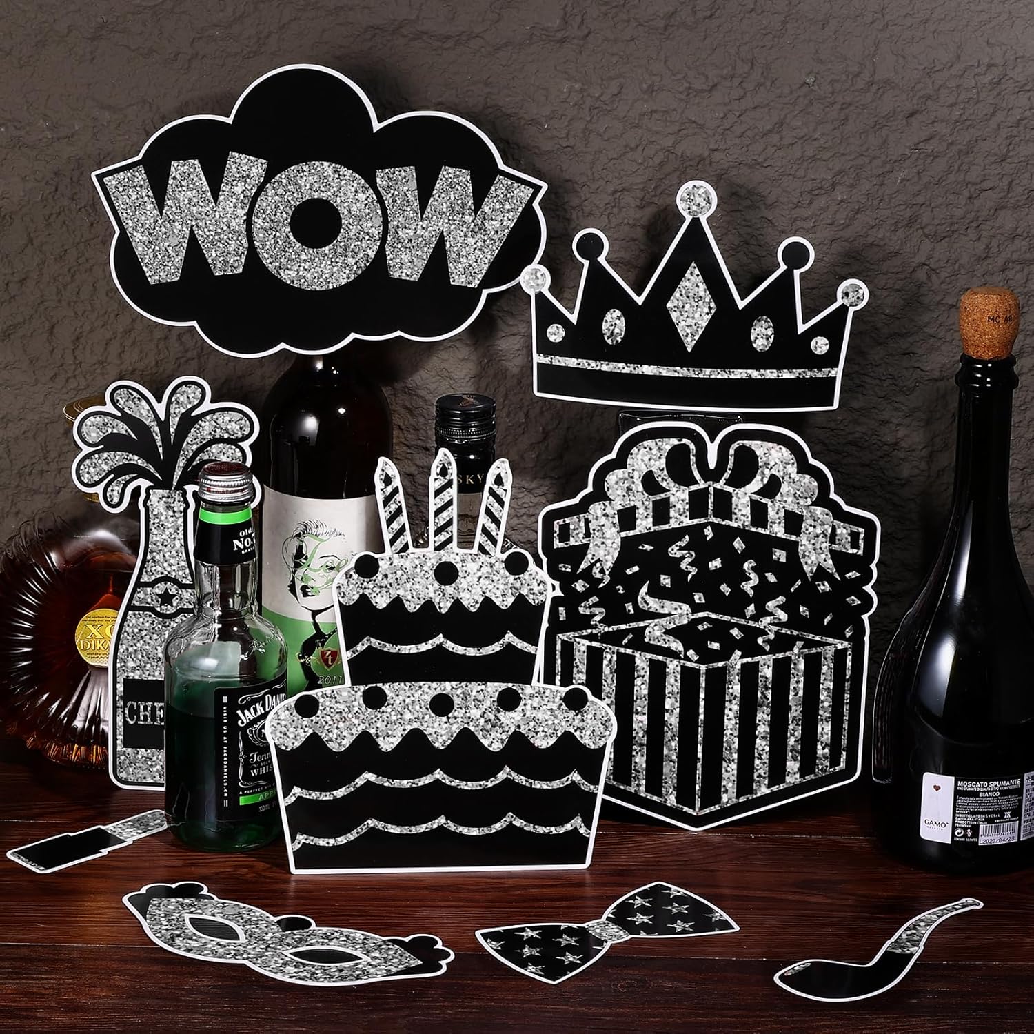 36PCS Silver and Black Photo Booth Prop, Party Photo Booth Props for Photoshoot Birthday Party Photobooth New Year Graduation Anniversary Halloween
