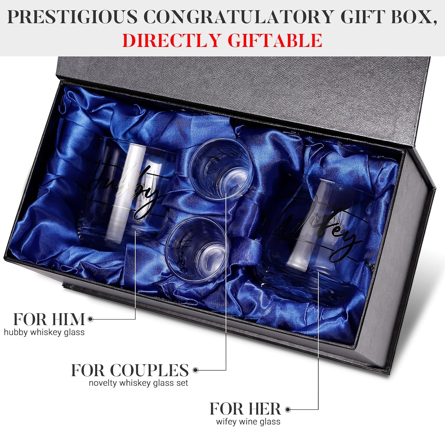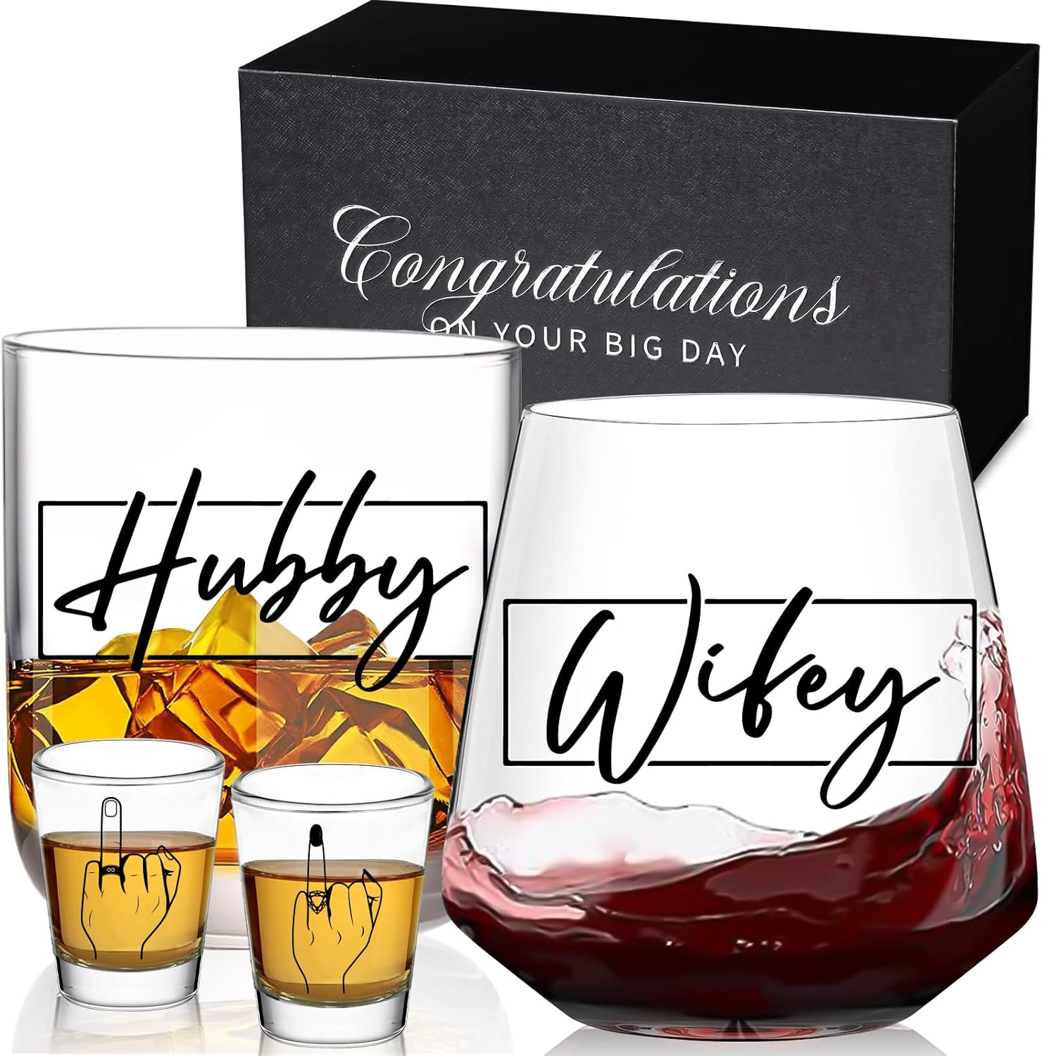 - LOVE INCARNATED: Celebrate love and laughter with our adorable wifey & hubby stemless wine whiskey wedding glass! Engraved with the words “wifey” and “hubby”, beautifully crafted pair of glasses makes a great wedding gifts for couples 2024, engagement gifts, bridal shower gifts, mr and mrs gifts, bride and groom gifts for couples, making every sip of wine romantic.